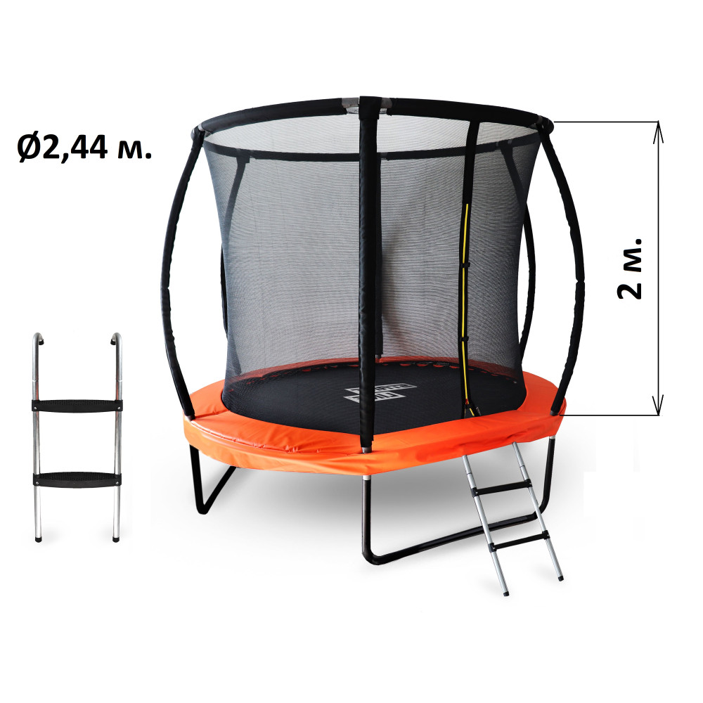 Батут 8 футов (2,44 м) с внутренней сеткой и лестницей идеально подходит для размещения на открытых площадках. Высокое качество используемых в их производстве материалов обеспечивает долговечность батутов даже при интенсивном использовании. Стальные пружины, нейлоновая защитная сетка, ткань ПВХ повышенной плотности.
