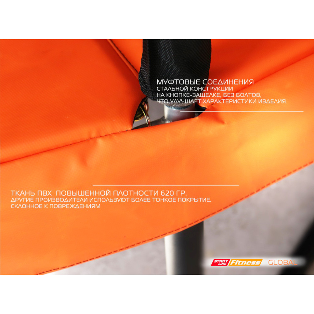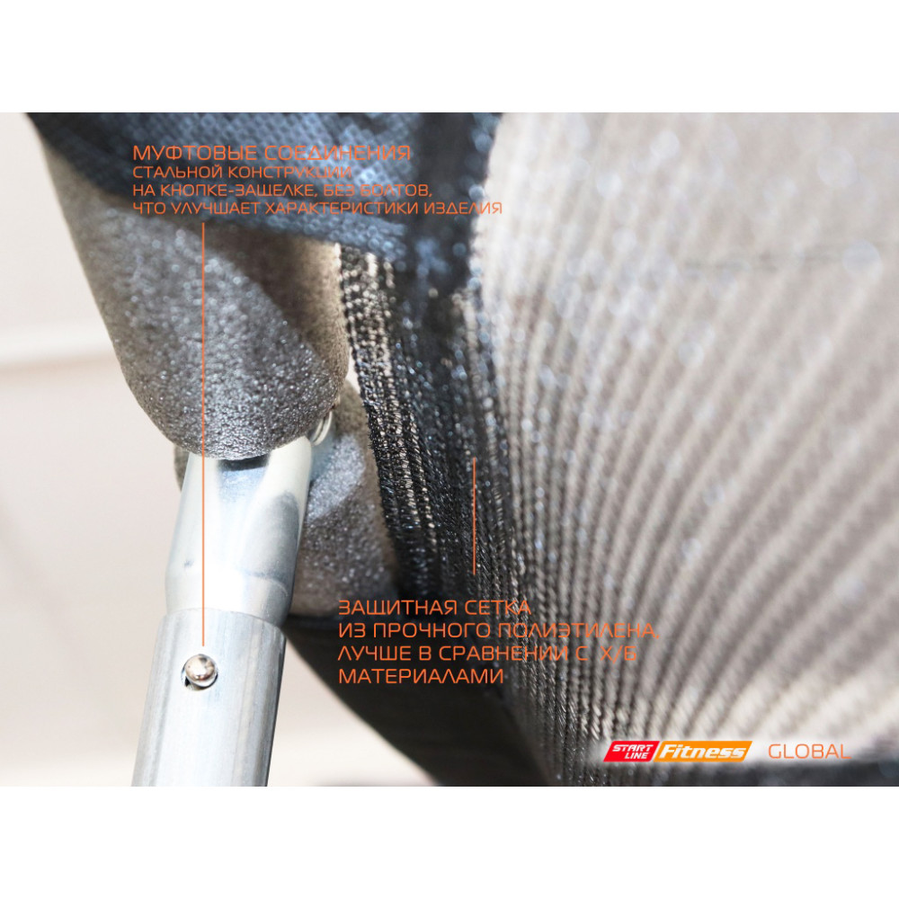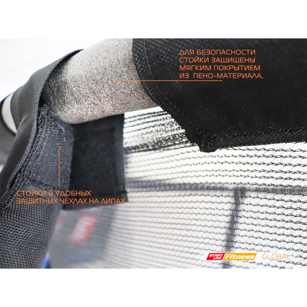 В комплекте обязательно идет внешняя защитная сетка, которая оберегает вас от случайного падения. Сетка, сделанная из нейлона высокой прочности, надежно крепится к стойкам батута. Вход через сетку выполнен на молнии с фиксирующими защелками с внешней стороны.
