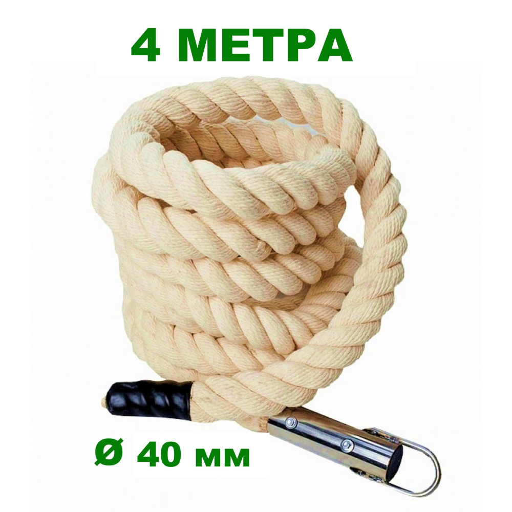 Канат для лазания длиной 4 метра с диаметром 40 мм, выполненный из хлопчатобумажного материала, обеспечивает прочность и долговечность.