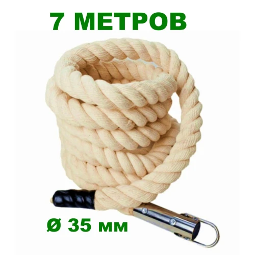 Хлопчатобумажные канаты спортивного назначения длиной 7 метров. Имеется стальная петля и фиксатор на другой стороне. Толщина гимнастического каната 35 мм подходит для подростков и детей. В наличии есть другие виды гимнастических канатов диаметров до 50 мм.