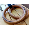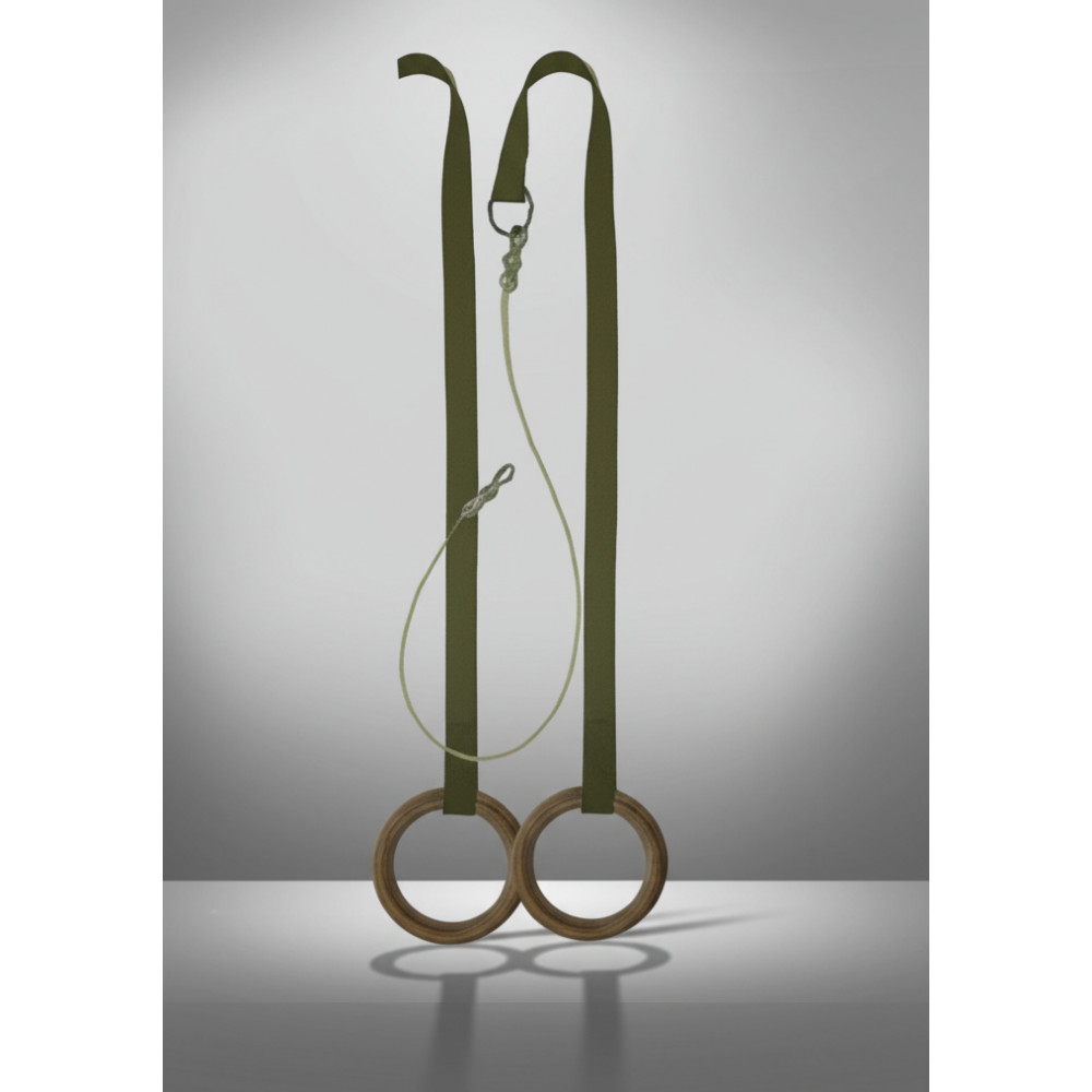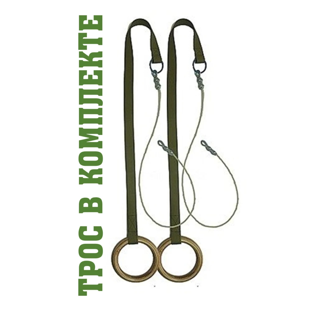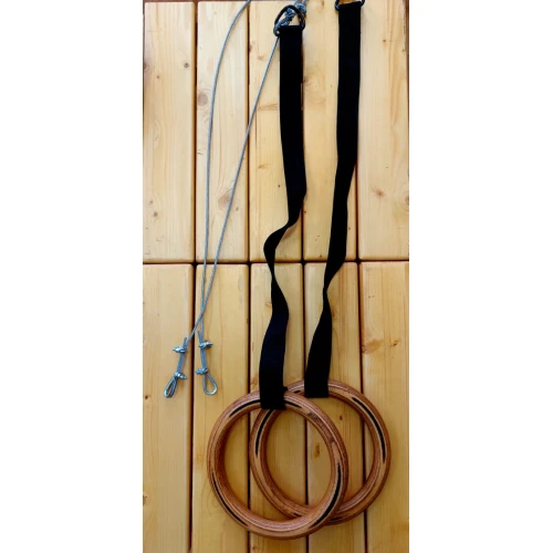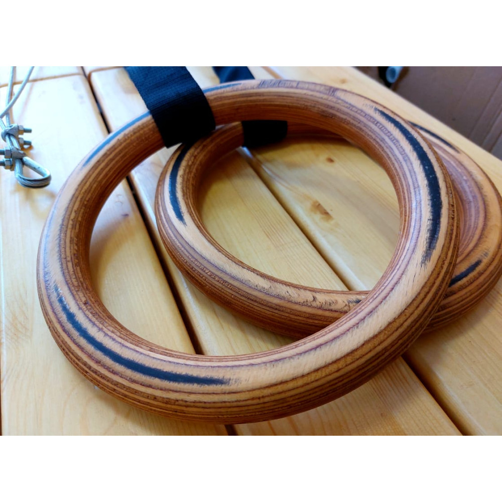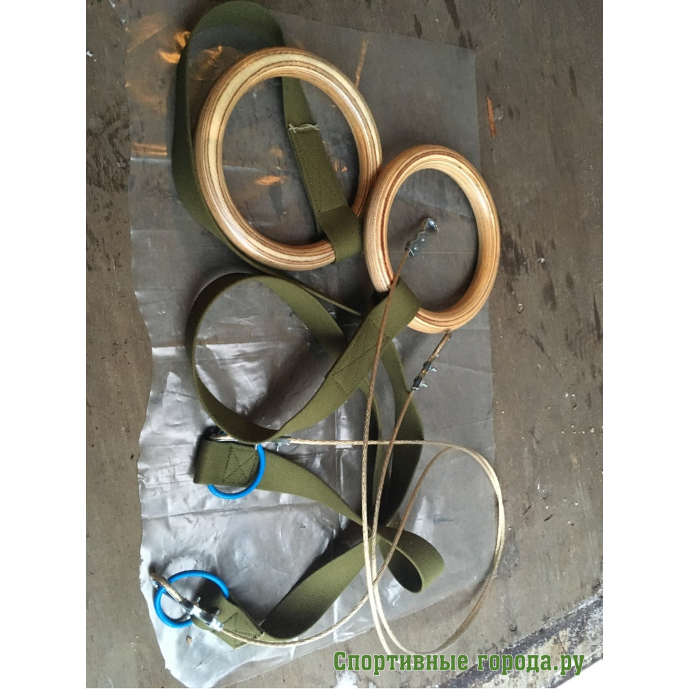 Кольца гимнастические с тросом длиной 2 метра и дополнительной стропой 1 метр, диаметром 23 см, произведённые из многослойной фанеры толщиной 30 мм.