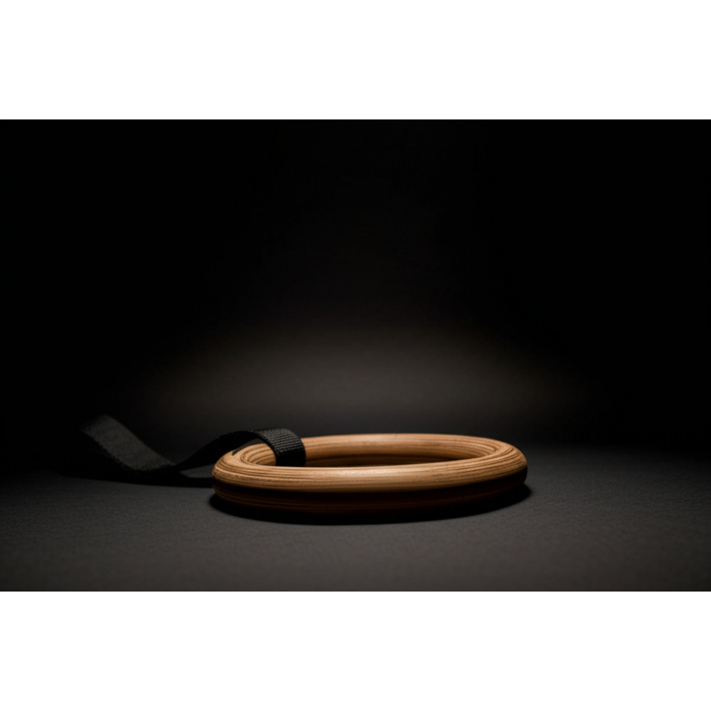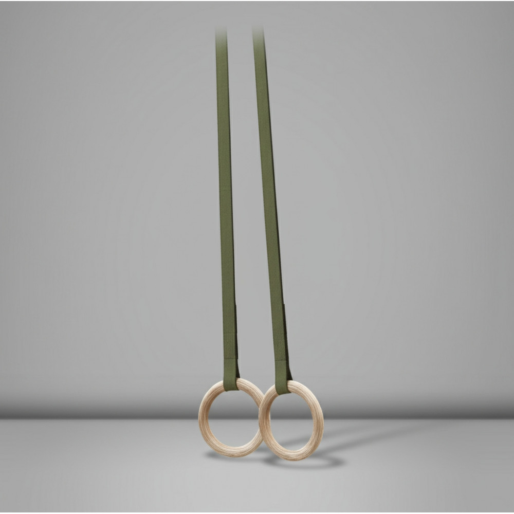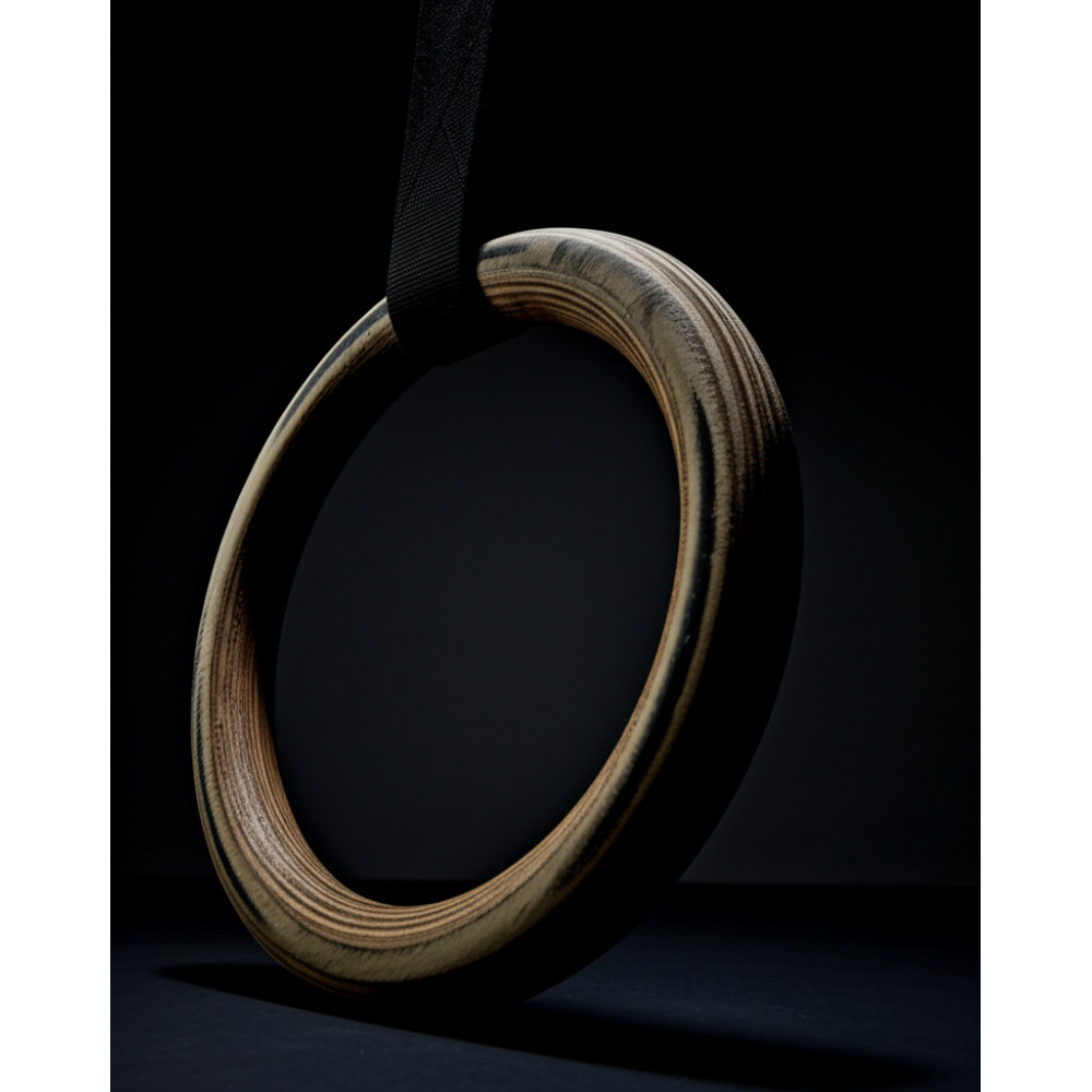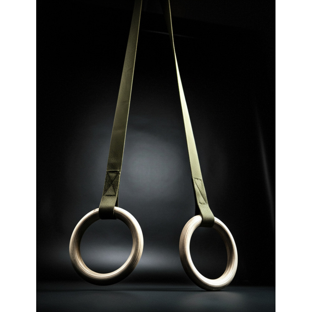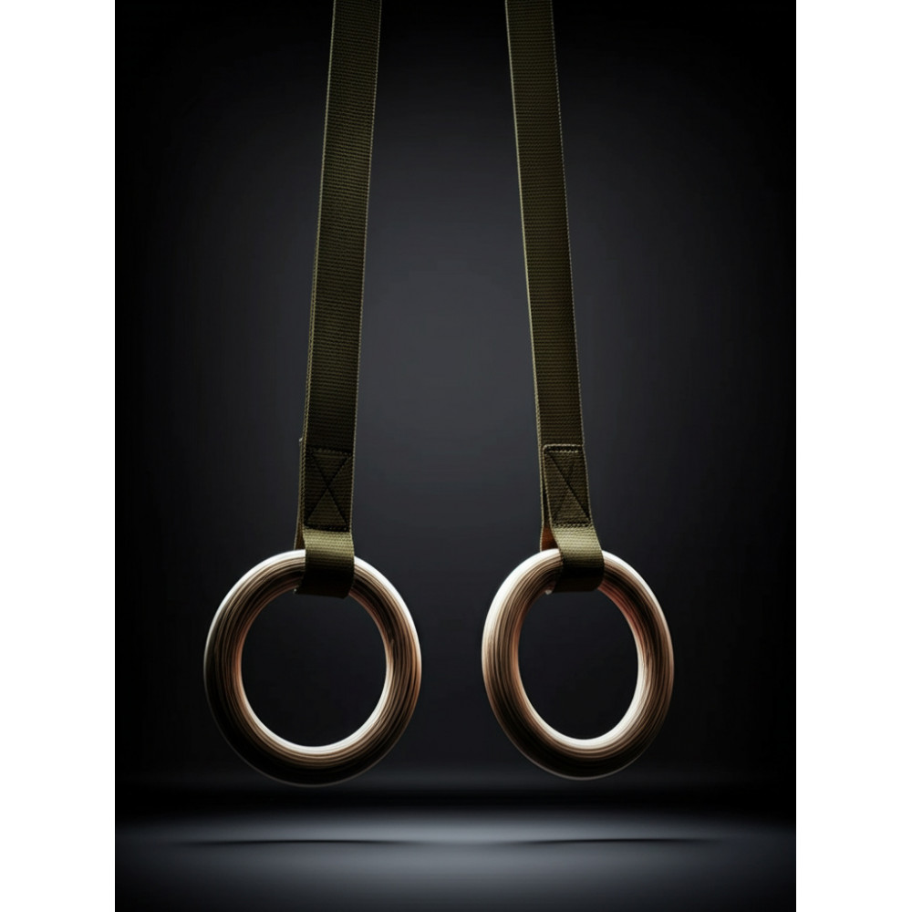 Кольца гимнастические с тросом длиной 2 метра и дополнительной стропой 1 метр, диаметром 23 см, произведённые из многослойной фанеры толщиной 30 мм.