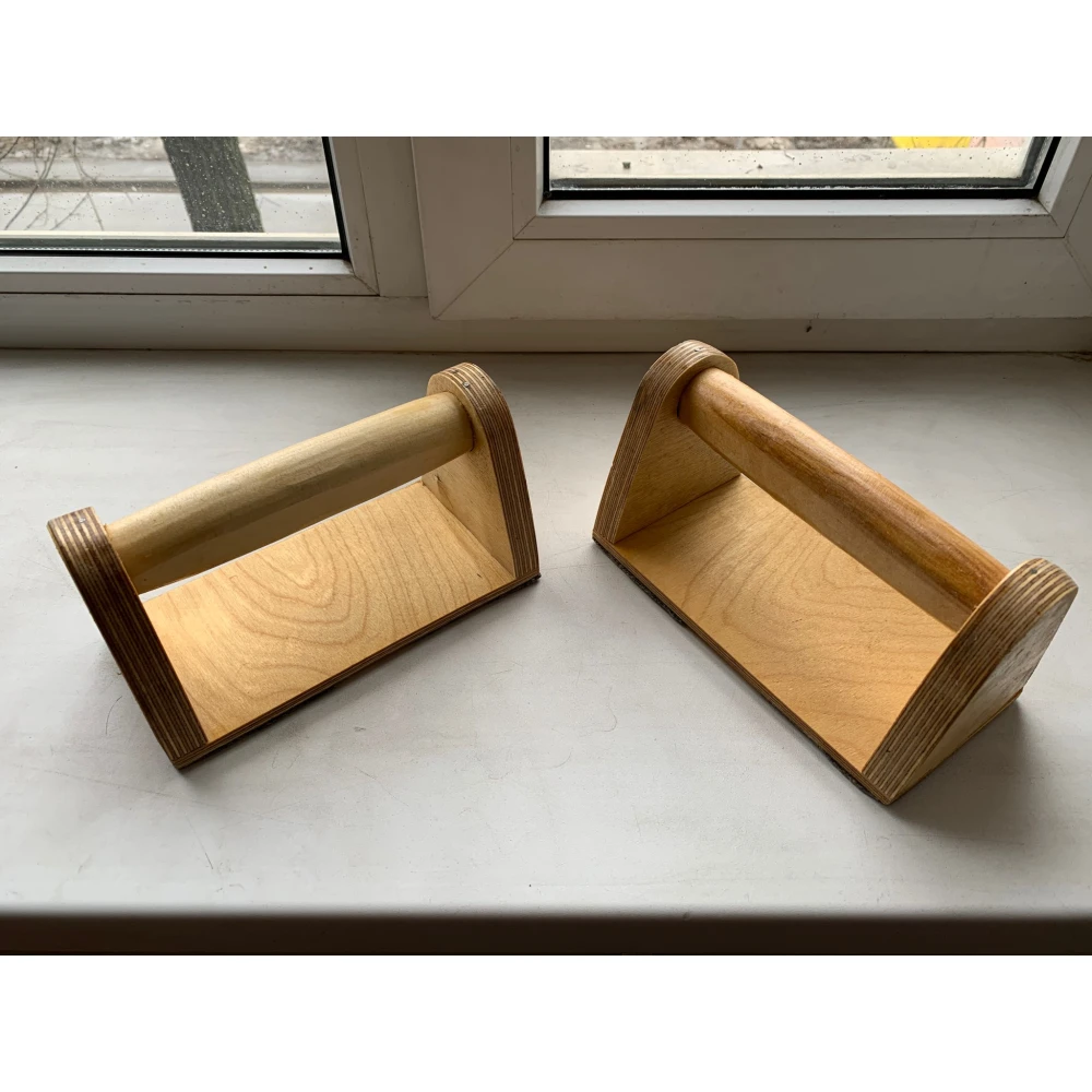 Стоялки изготовлены из твердых лиственных пород дерева, что обеспечивает им надежность и долговечность. Поверхность покрыта лаком, что придает изделию дополнительную защиту и эстетичность. Эти стоялки используют для тренировки баланса, координации и развития вестибулярного аппарата.