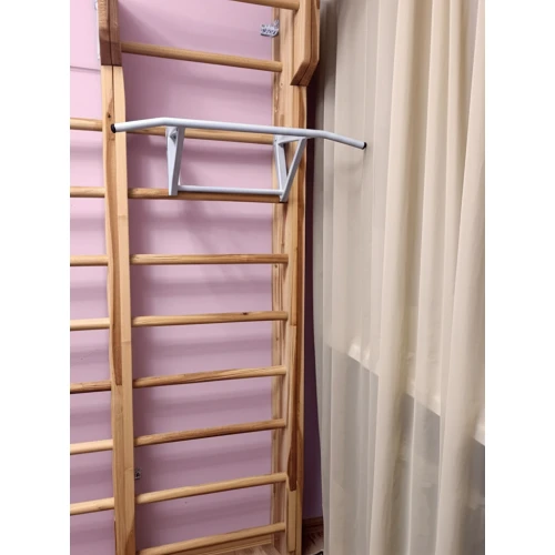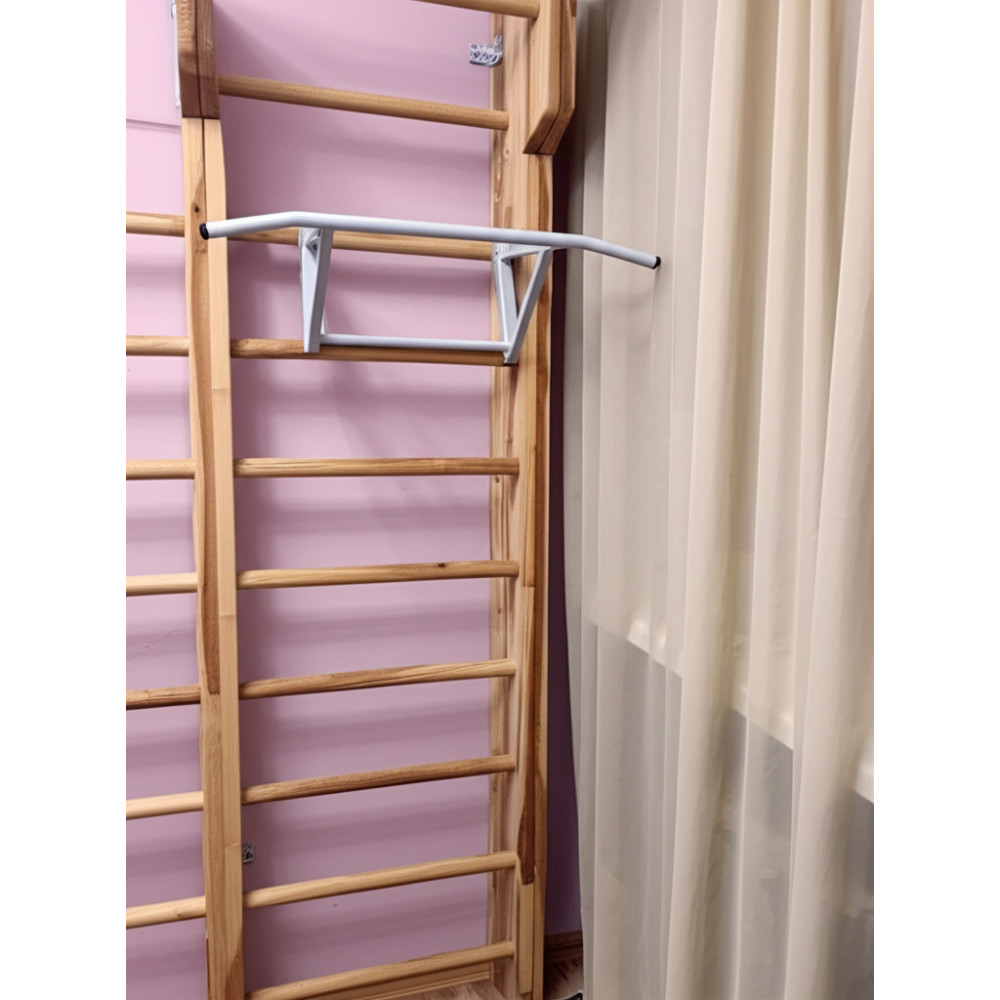 Навесной турник представляет собой универсальный тренажер, который устанавливается на шведскую стенку с помощью удобных крюков. Эта конструкция обеспечивает: