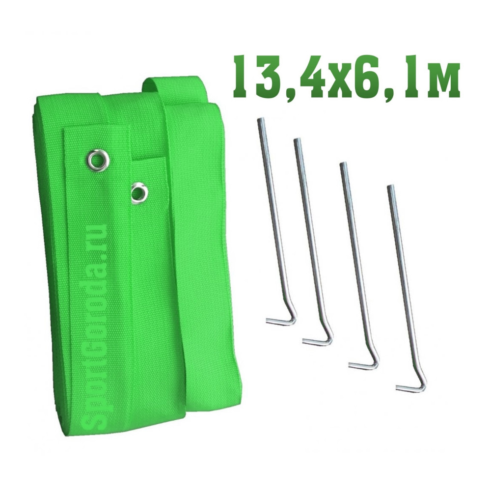 Лента зеленого цвета для разметки площадки для игры в бадминтон с размерами 13.4х6.1 метров, включающая 4 прочные ленты и 4 колышка для фиксации.