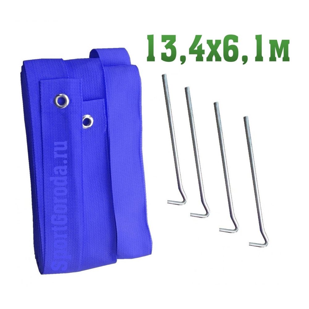 Разметка площадки для бадминтона с размерами 13.4х6.1 метра, выполненная из прочных синих лент и комплектом из 4 колышков для надежной фиксации.