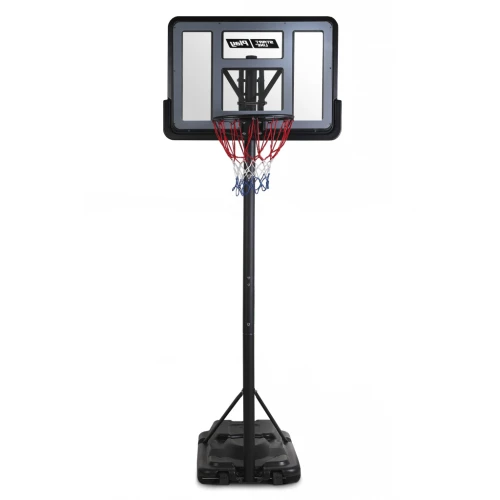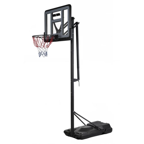 - Ударопрочный щит: Баскетбольный щит выполнен из прочного усиленного оргстекла размером 75х110 см, что гарантирует долговечность и устойчивость к ударам.