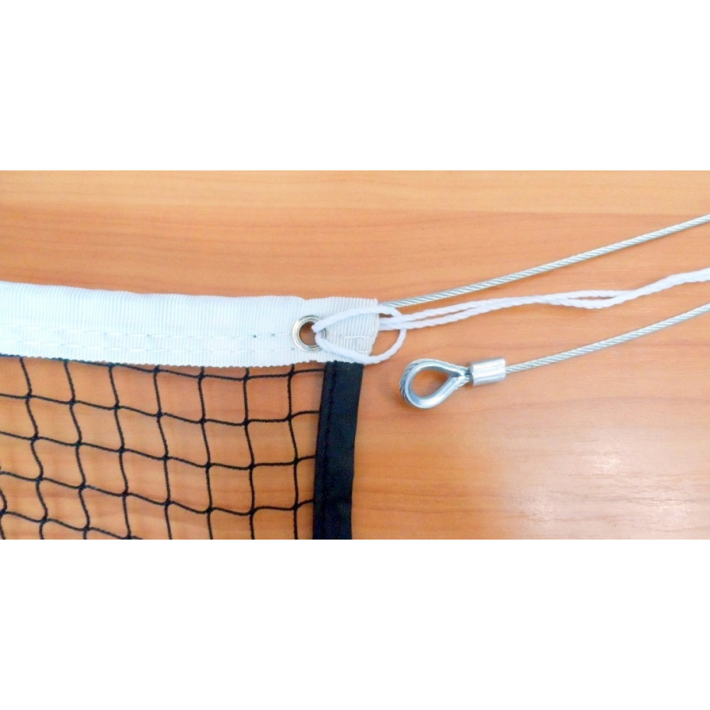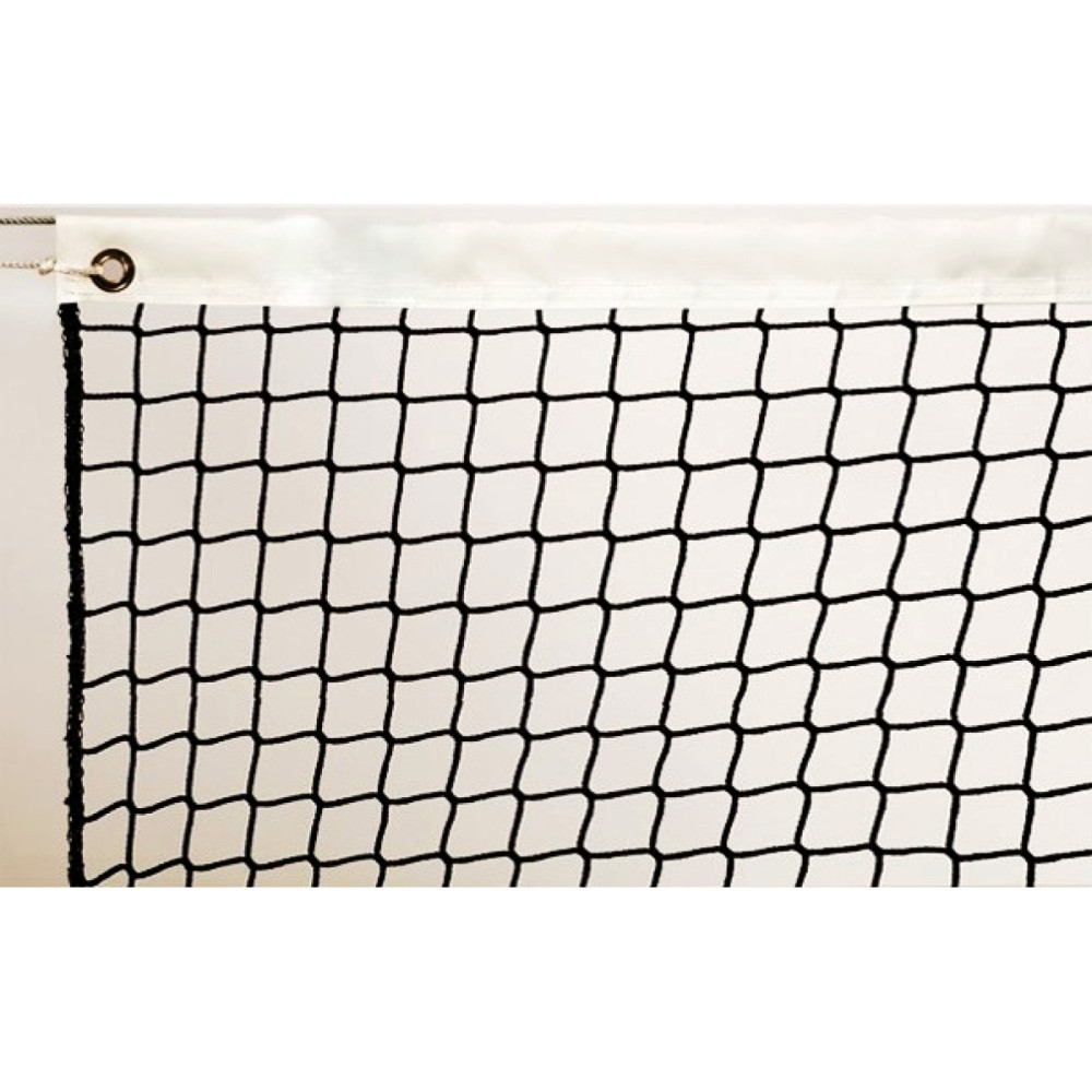 Сетка для большого тенниса двойного плетения 4 мм, с размерами 1,07х12,80 м, сделанная из полипропилена и капрона, в комплекте со стальным тросом.