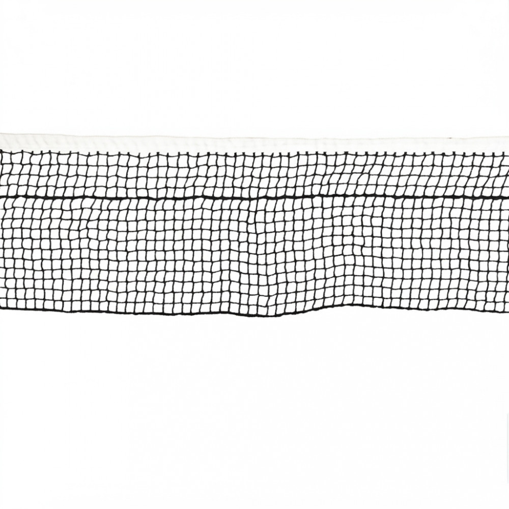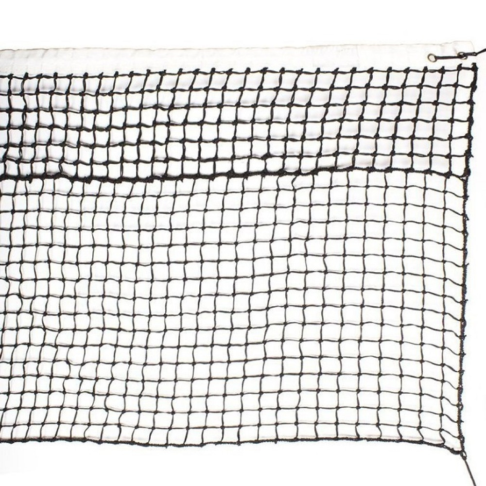 Теннисная сетка двойного плетения с размерами 1,07х12,80 м, изготовленная из прочной нити диаметром 3,0 мм и комплектующаяся стальным тросом.