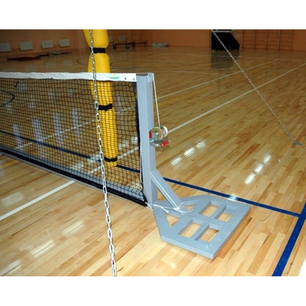 Также возможно изготовление комплекта без серединной штанги и противовеса с креплением стоек на плоские закладные элементы. Сетка натягивается с помощью специального механизма натяжения, который называется внешний храповик.