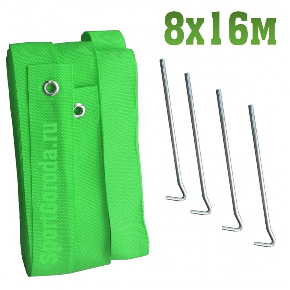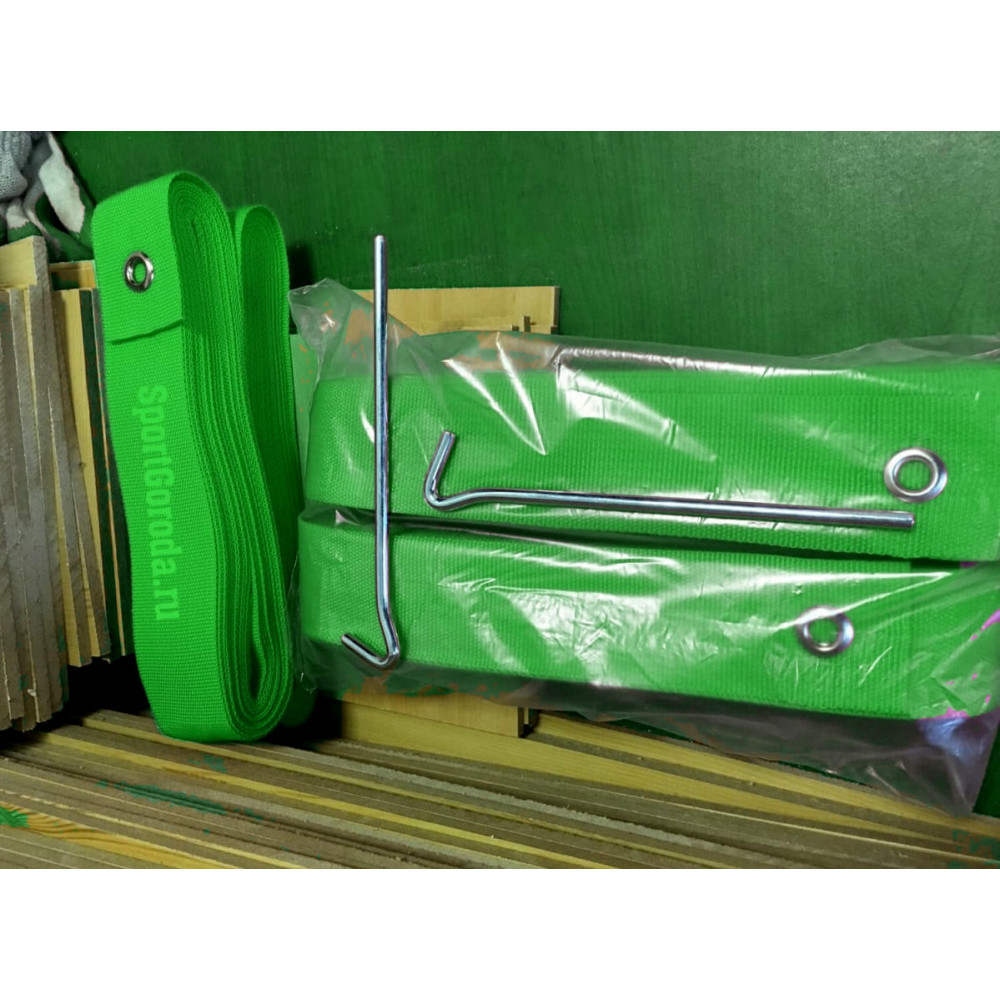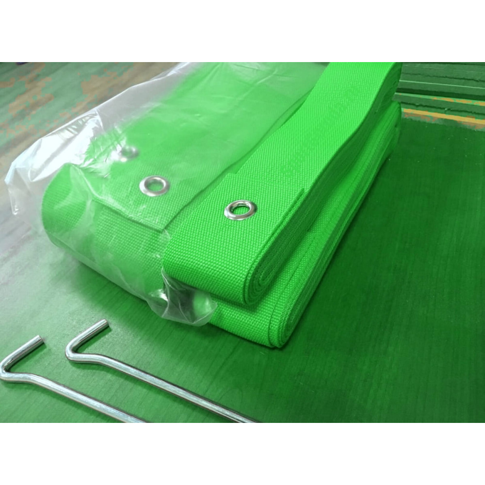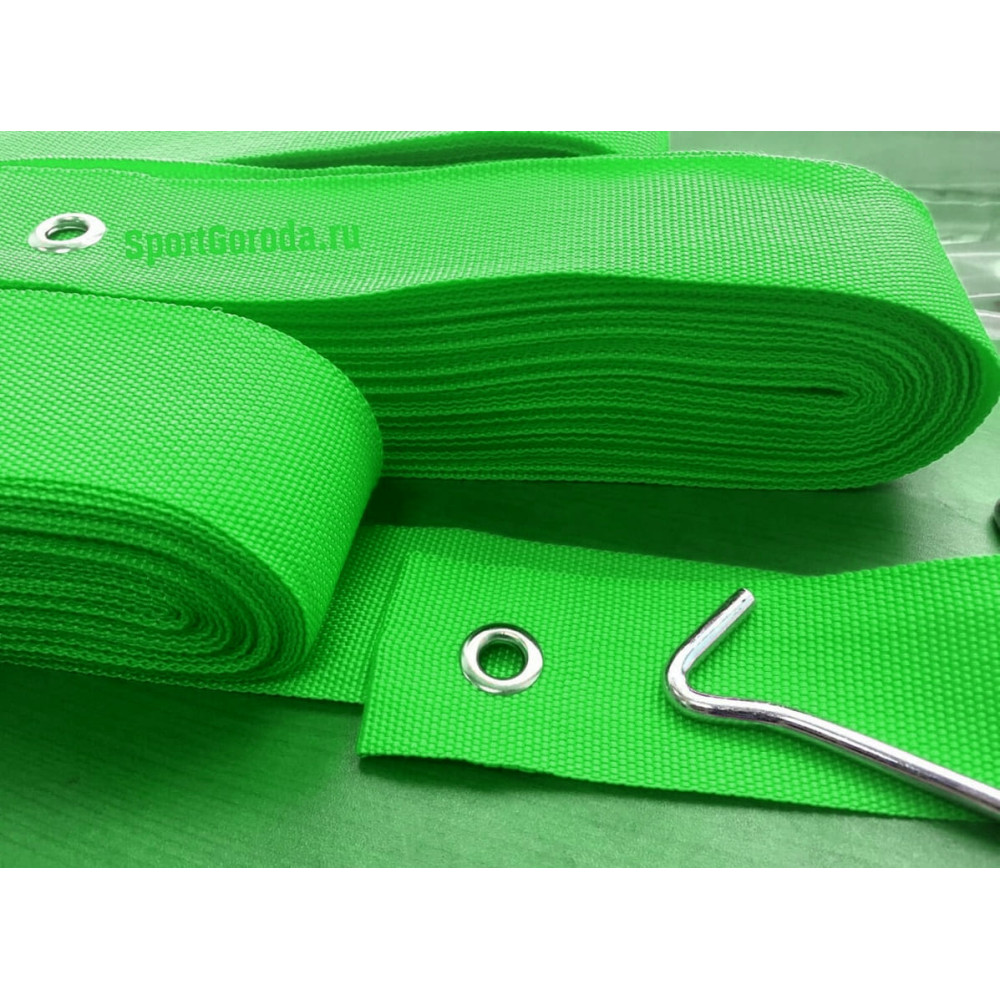 Материал сделан из прочного полиэстера зеленого цвета с люверсами. Цвет не теряет яркость в течении времени. В комплект идет 4 металлических крепления для соединения лент через люверсы. Ленты это метки, которые наносятся на поверхность. Эти ленты визуально спортивнойплощадки в соответствии с стандартами игры.
