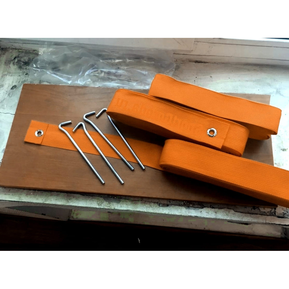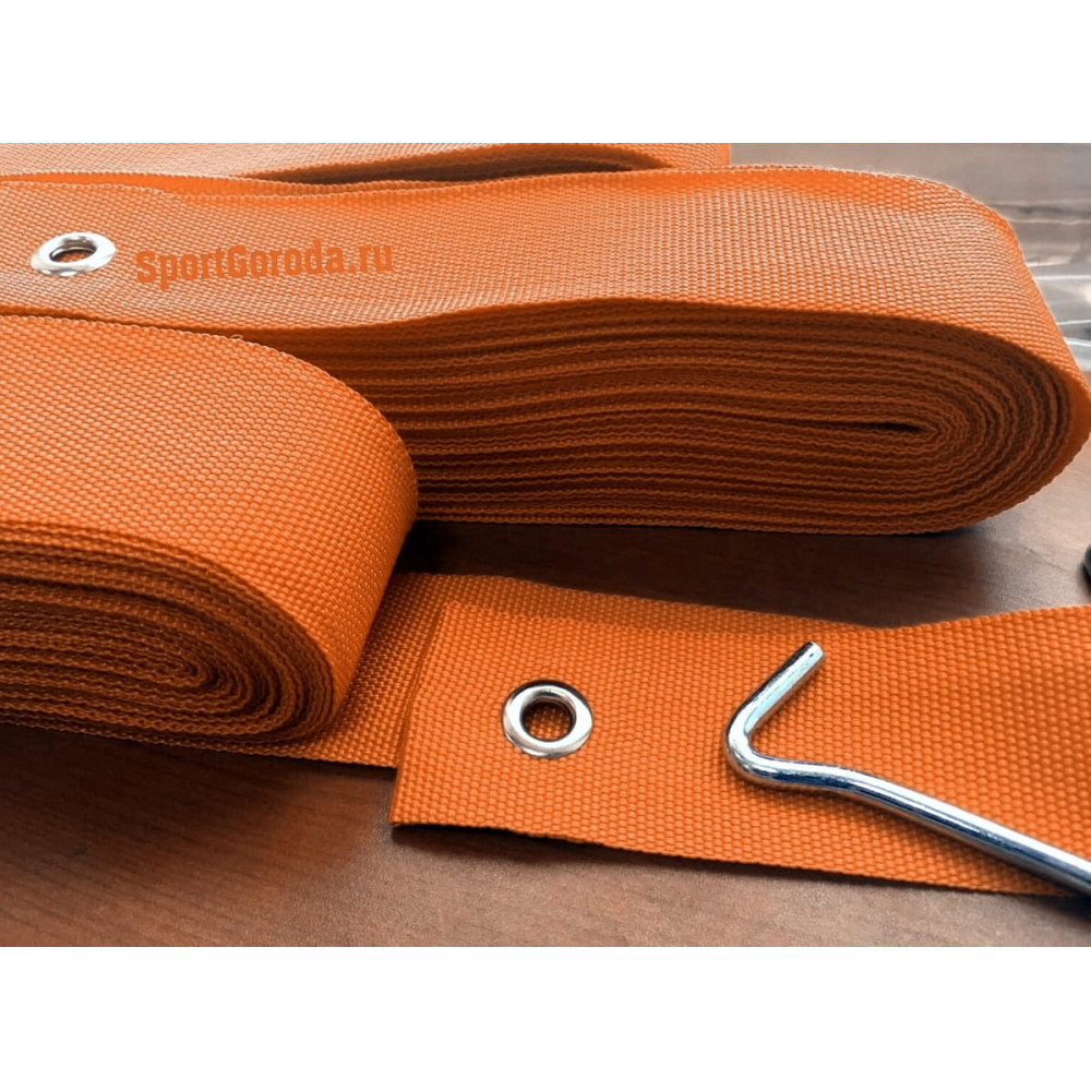 Материал сделан из прочного полиэстера оранжевого цвета с люверсами. Цвет не теряет яркость в течении времени. В комплект идет 4 металлических крепления для соединения лент через люверсы.