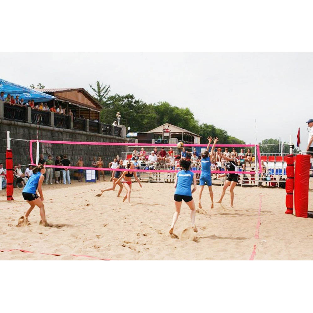 Эта сетка с ярким розовым цветом не только выполняет свои функции, но и добавляет эстетики спортивной площадке на любом пляже.