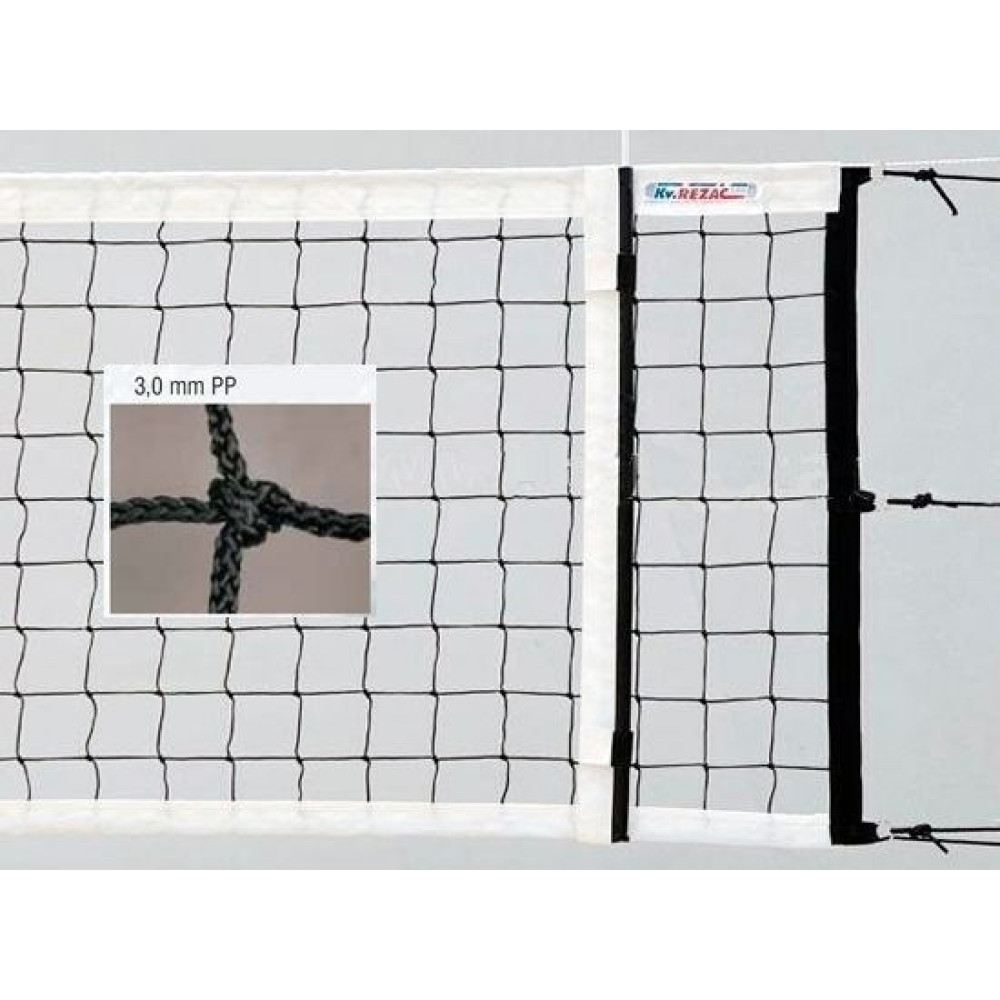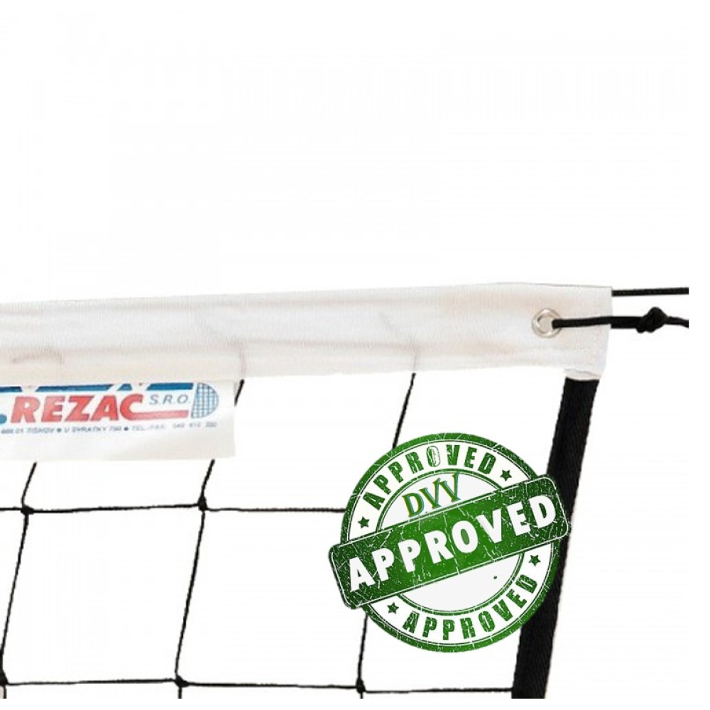 Профессиональная волейбольная сетка KV.Rezac с размерами 950 х 100 см, черного цвета, диаметром нити 3 мм из 100% полипропилена, признана соответствующей стандартам DVV Approved.