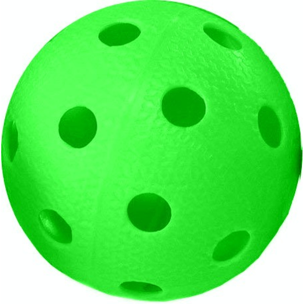 Зеленый мяч для флорбола, изготовленный из прочного пластика с рельефной поверхностью, весит 23 грамма и имеет диаметр 72 мм.