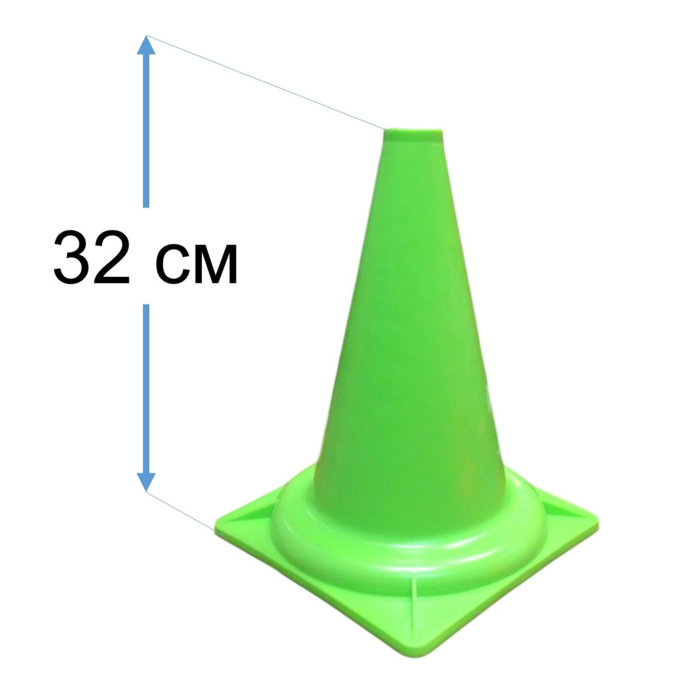 Пластиковый конус зеленого цвета высотой 32 см, изготовленный из прочного твердого пластика, предназначен для тренировок и разметки пространства.
