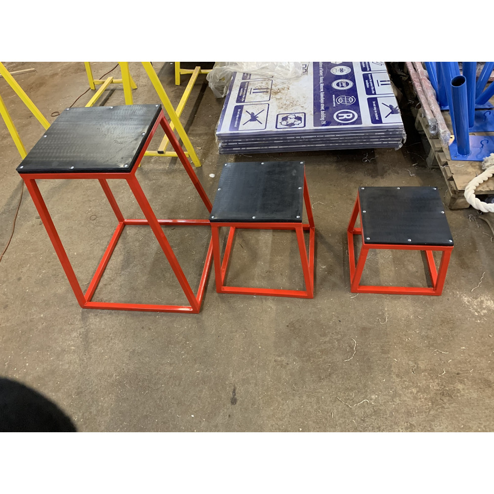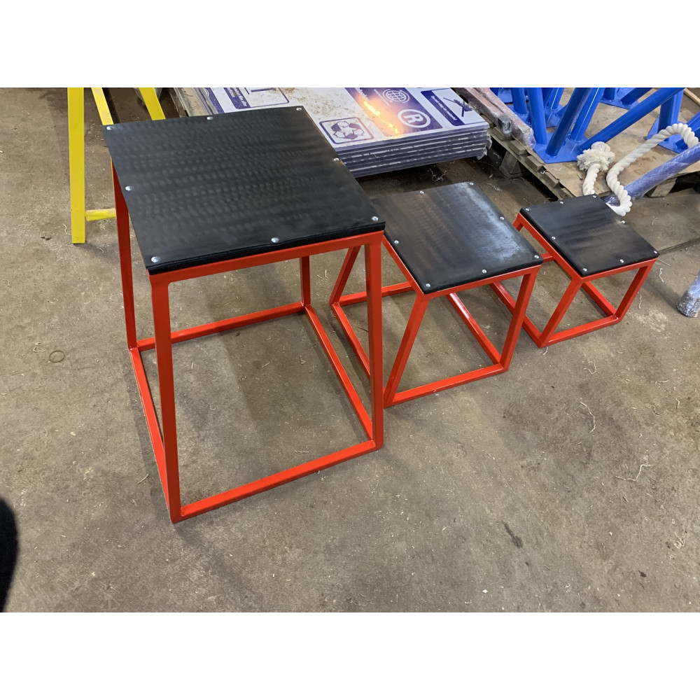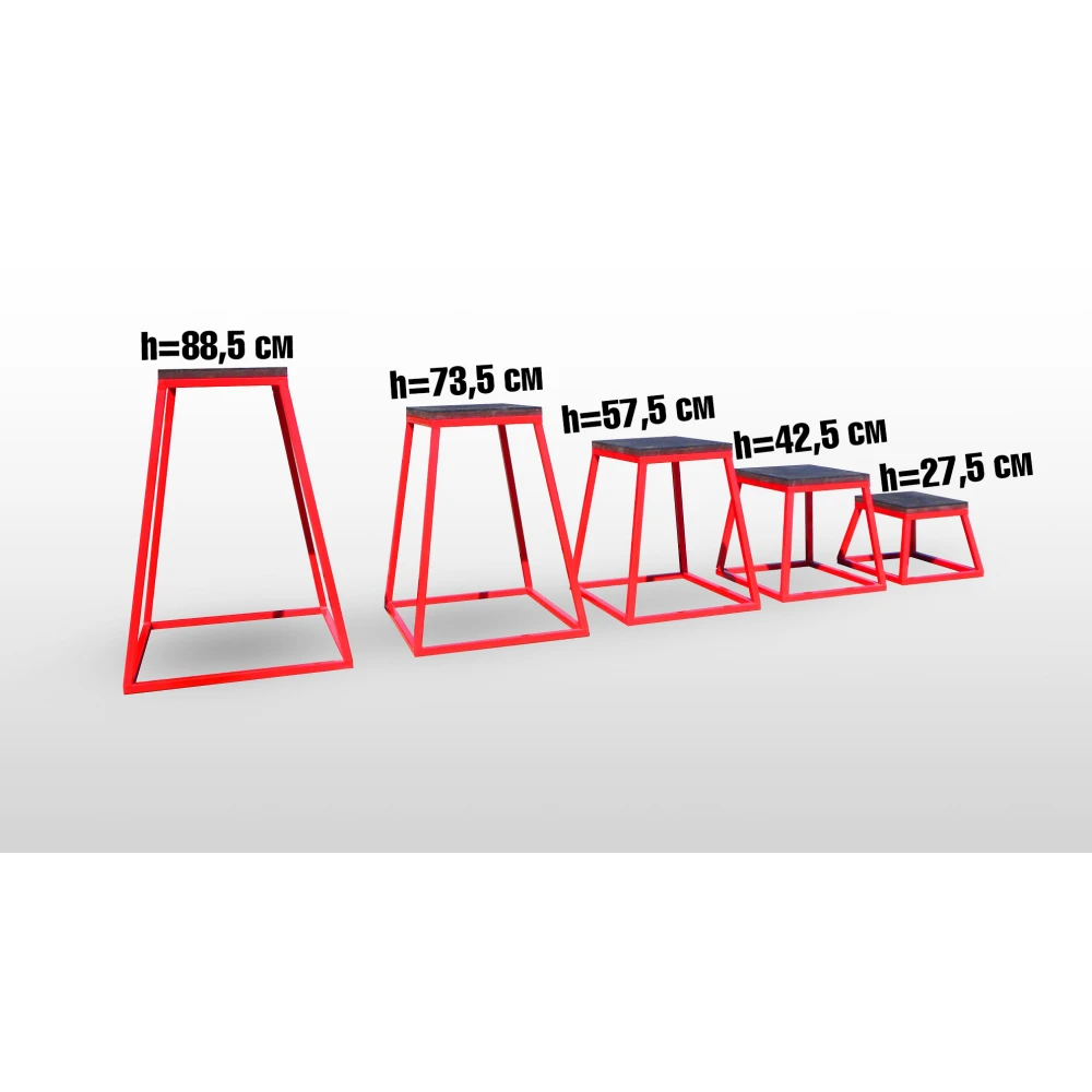 Набор прыжковых тумб (плиобокс) состоит из 5 шт., выполненных из фанеры и стали, с высотой от 27,5 до 88,5 см, предназначенных для тренировки мышц ног.
