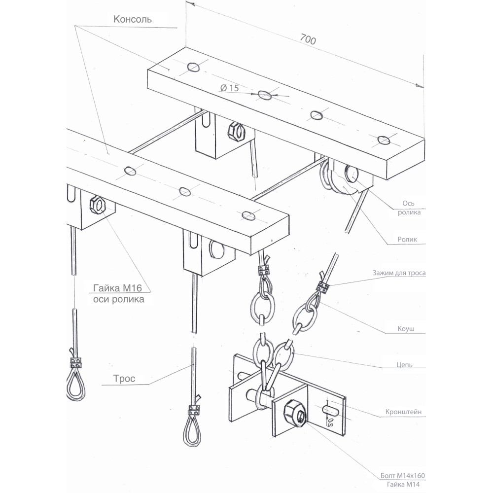 | Комплект | консоль 2 шт, кронштейн 1 шт, ролик 4 шт, болт М14*160 1 шт, гайка М14 1 шт, ось ролика 4 шт, коуш 4 шт, зажим 8 шт, цепь 0,7 м, трос 5 мм 2 шт по 7 м, заглушка 80*40 4 шт |