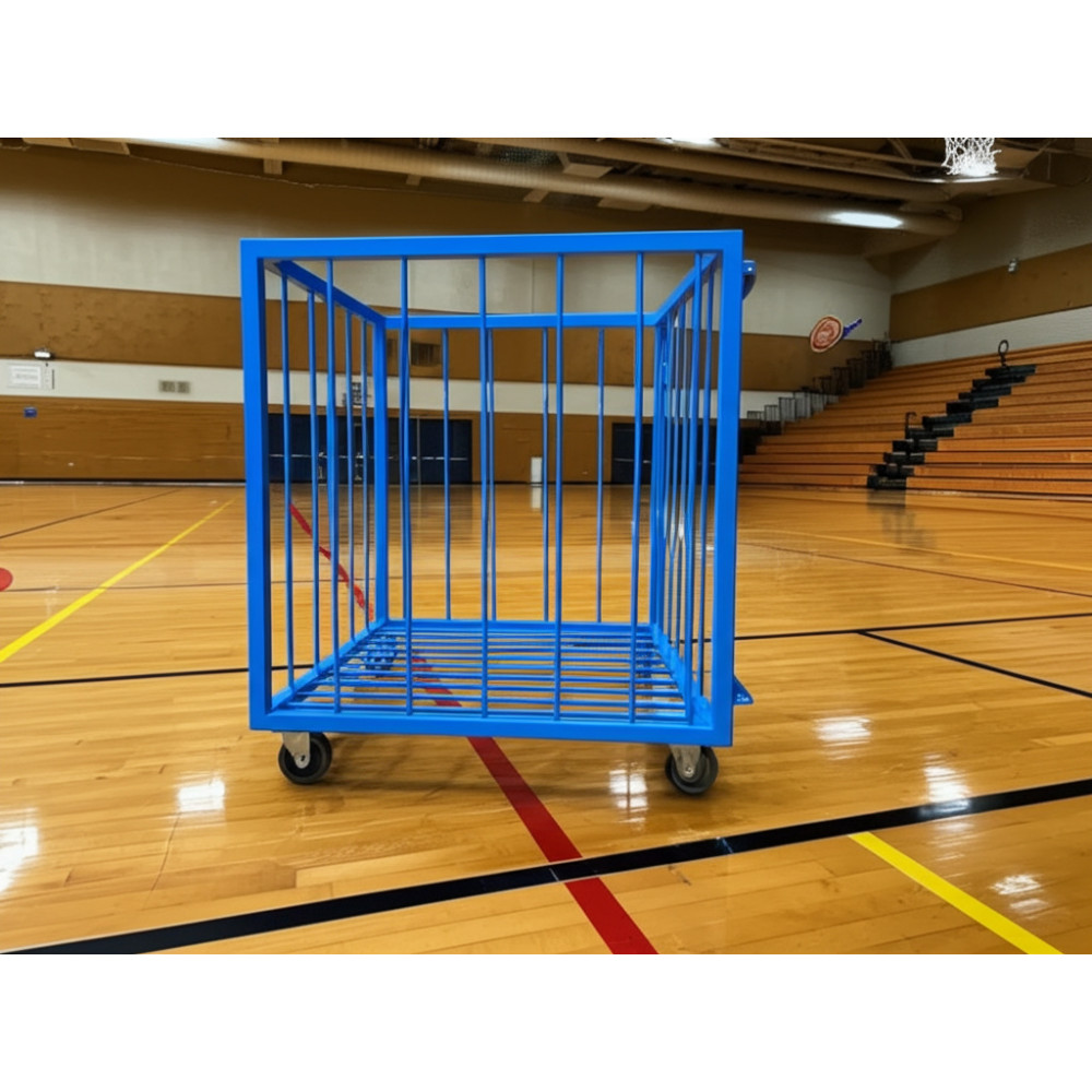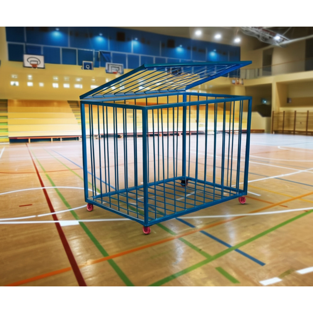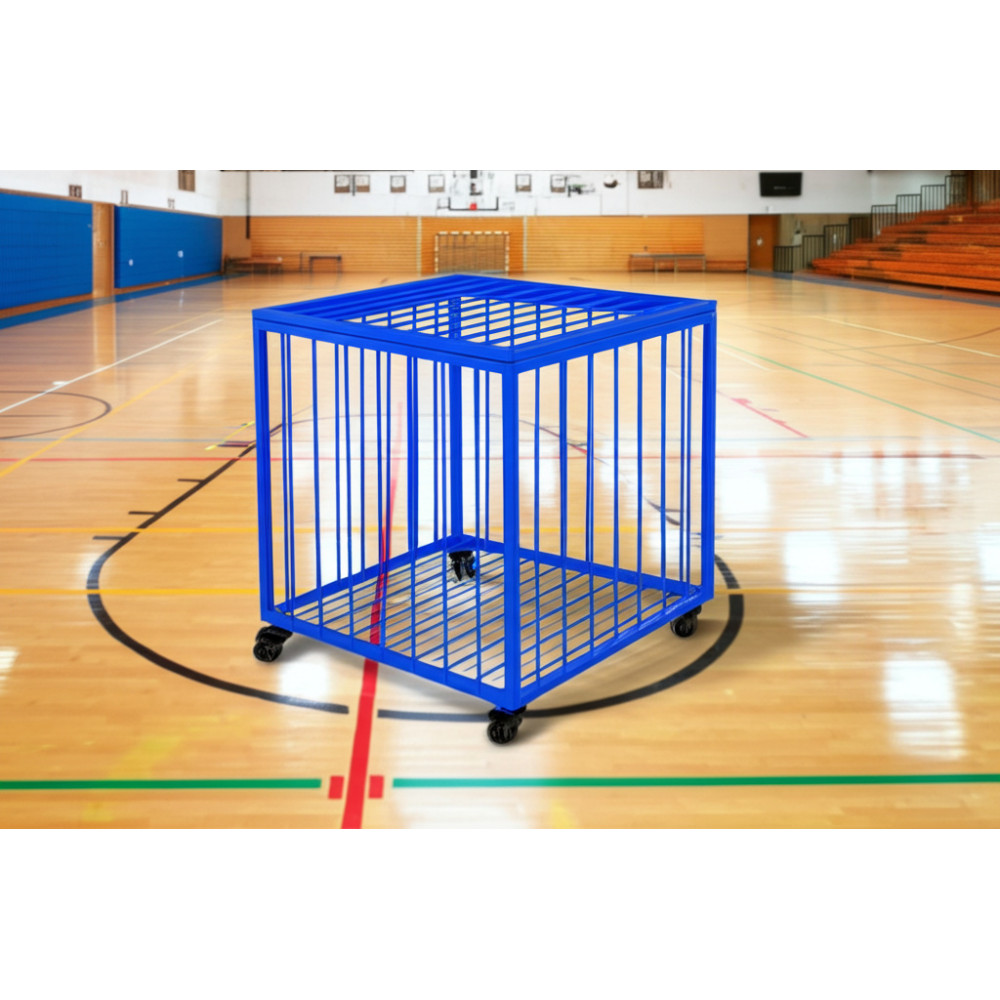 Металлическая корзина для мячей на колесиках, размеры 750х750х1050 мм, предназначена для хранения до 45 мячей.