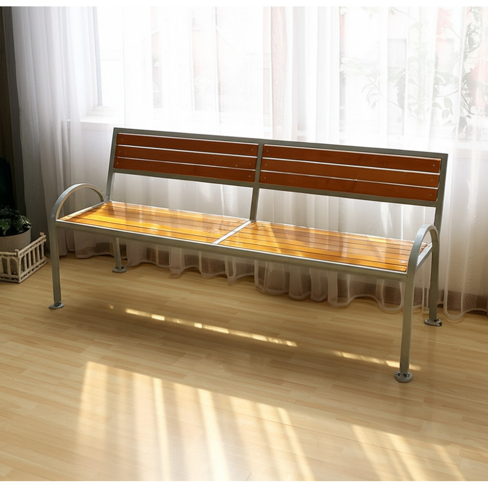 - Скамейка оснащена спинкой с деревянными элементами для удобства.