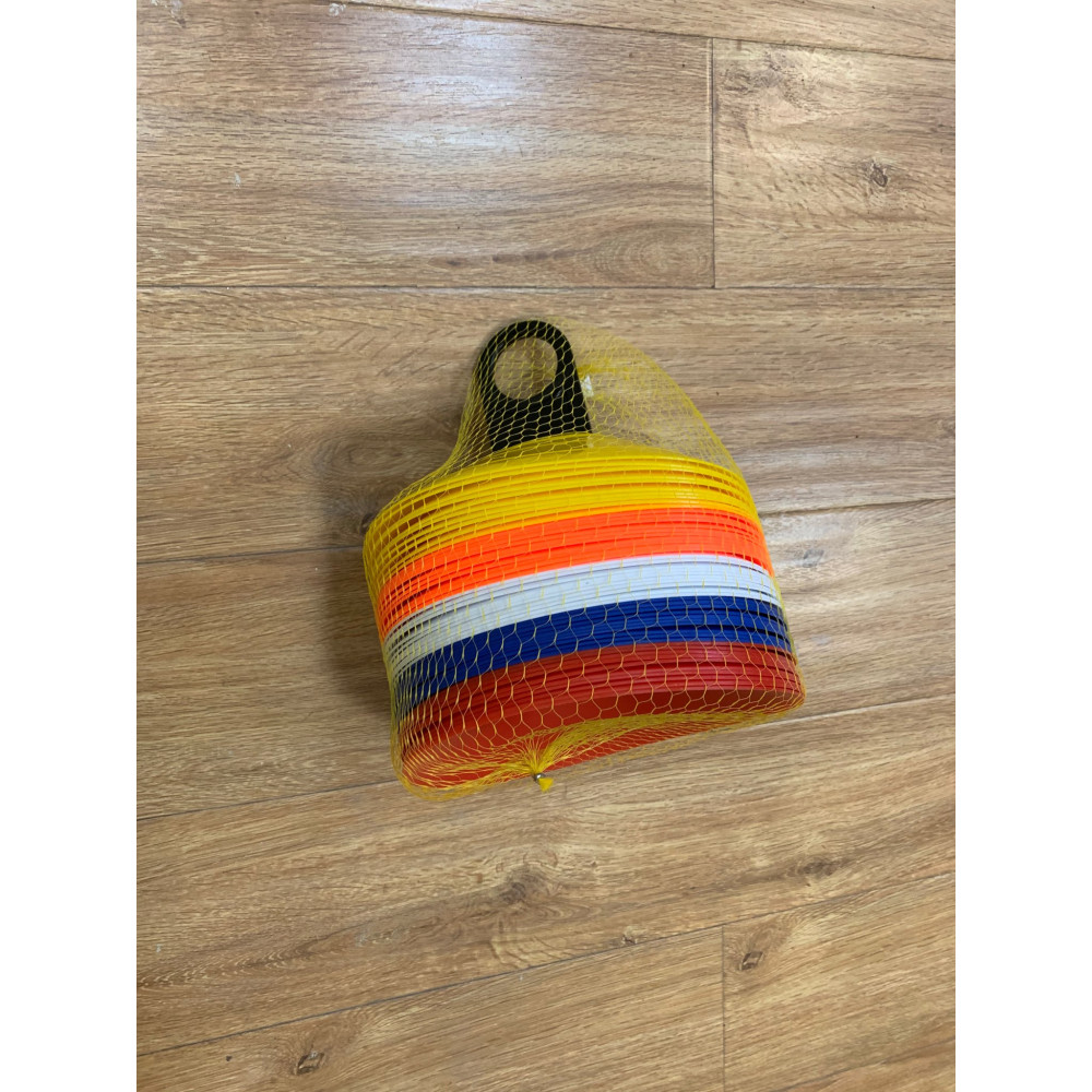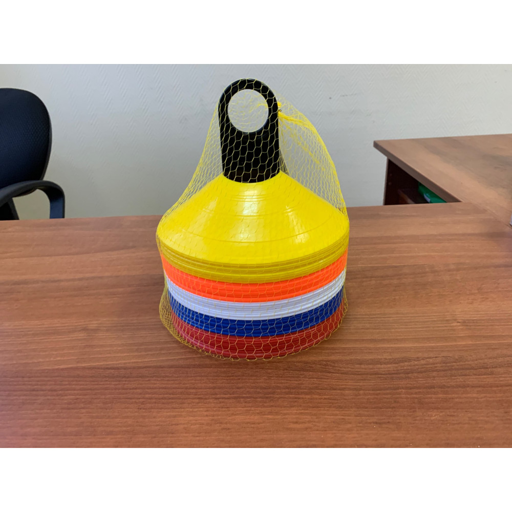Фишки для разметки поля в количестве 50 штук, высотой 5 см и диаметром 19,5 см, представлены в различных цветах: оранжевый, красный, желтый, белый и синий.