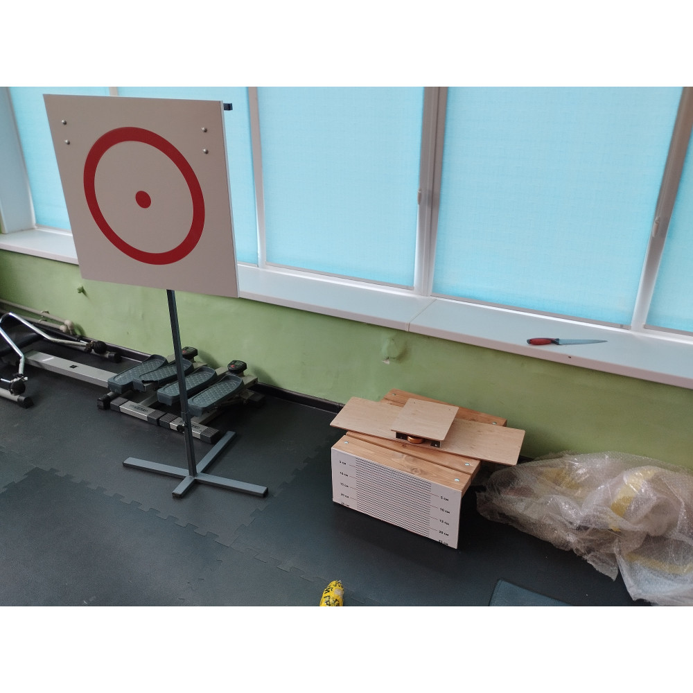 Щит для метания в цель на подставке с размерами 1800X600X600 мм и регулировкой высоты от 130 до 180 см.