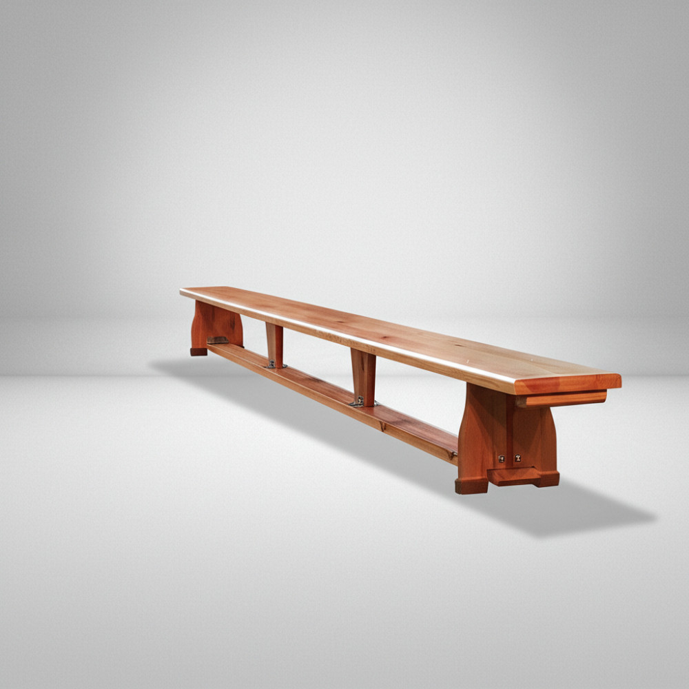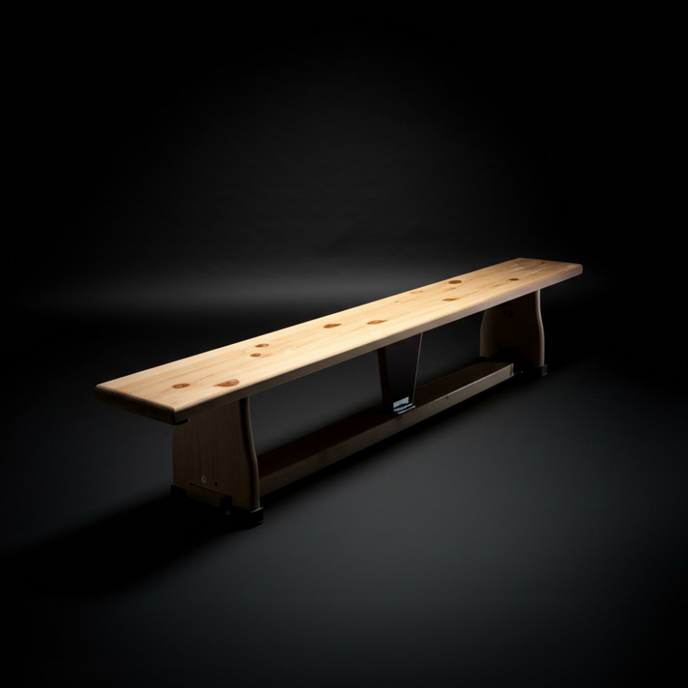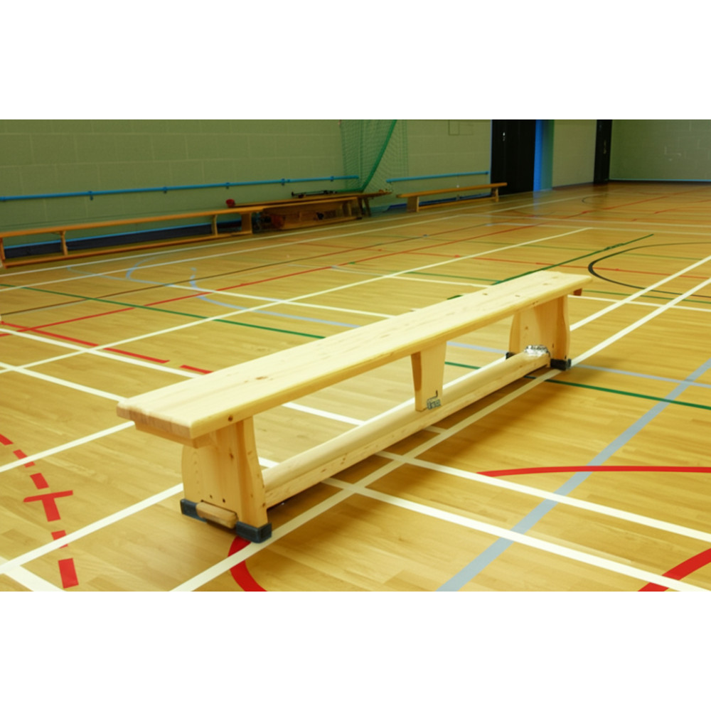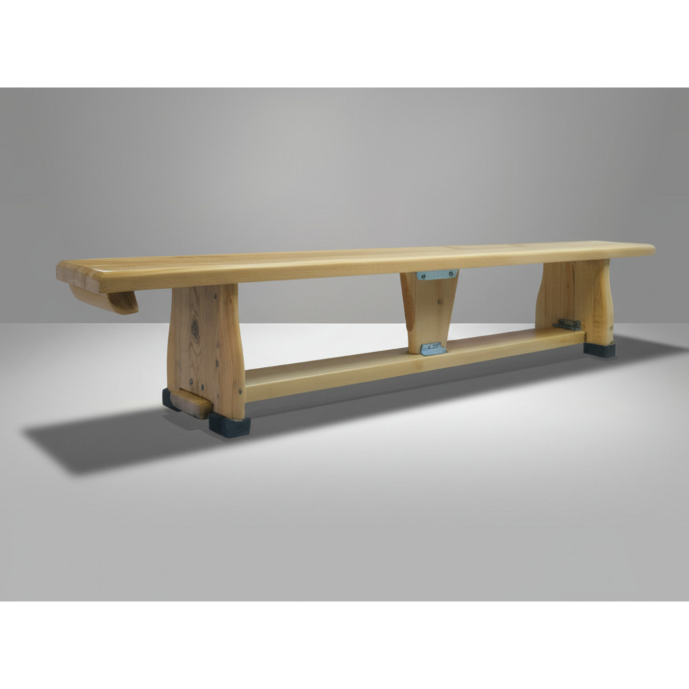 Скамья гимнастическая длиной 1,5 метра с деревянными ножками, предназначенная для использования в образовательных учреждениях и спортивных залах.