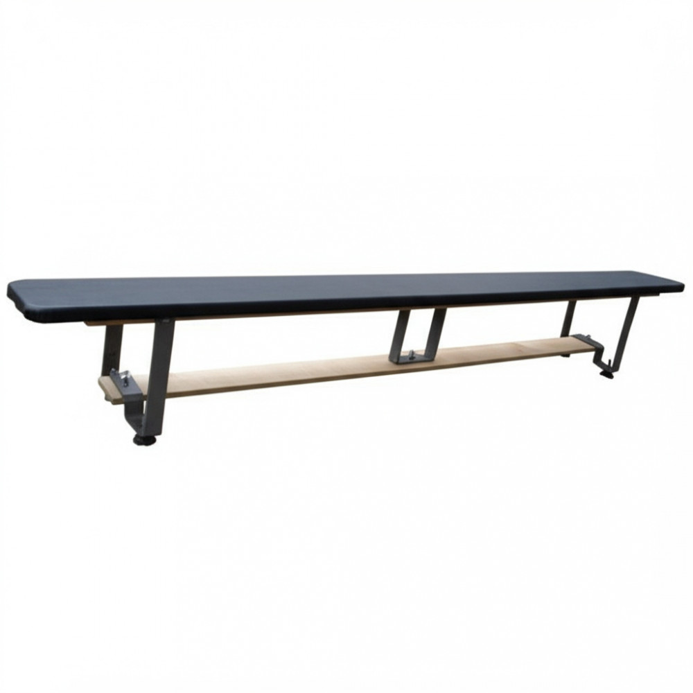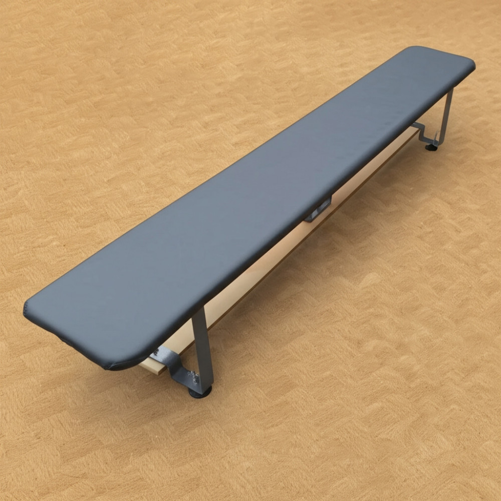 Гимнастическая скамья мягкая длиной 1,5 м с металлическими ножками, предназначенная для различных спортивных упражнений.