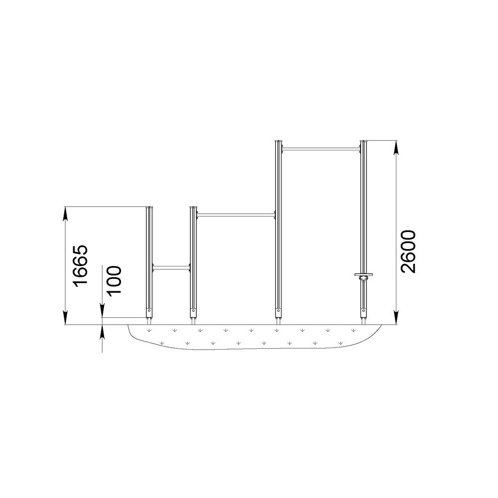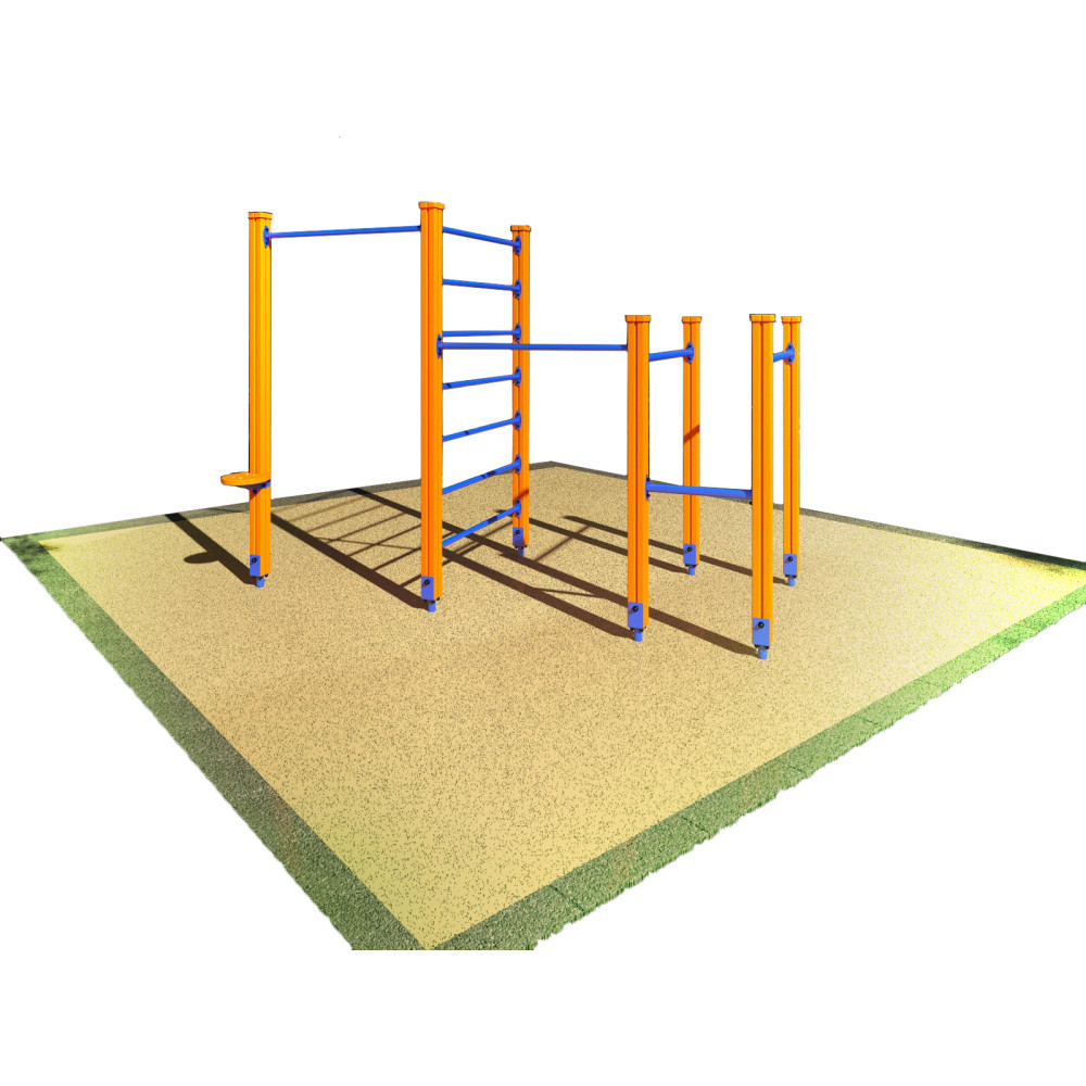 Данный спортивный комплекс подходит для выполнения упражнений, направленных на развитие основных групп мышц. Его конструкция обеспечивает высокую стабильность и безопасность при занятиях. Все металлические элементы покрыты специальным раствором, что гарантирует влагостойкость и устойчивость к любым погодным условиям. Древесные детали обработаны для повышения их эксплуатационных характеристик.