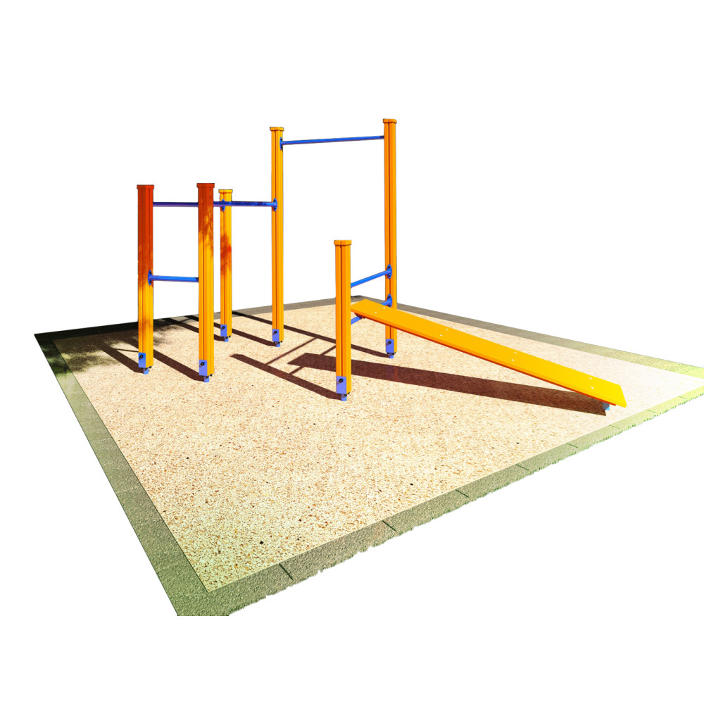 Спортивный комплекс № 14 включает наклонную скамью, брусья и турник, предназначен для тренировки основных групп мышц.