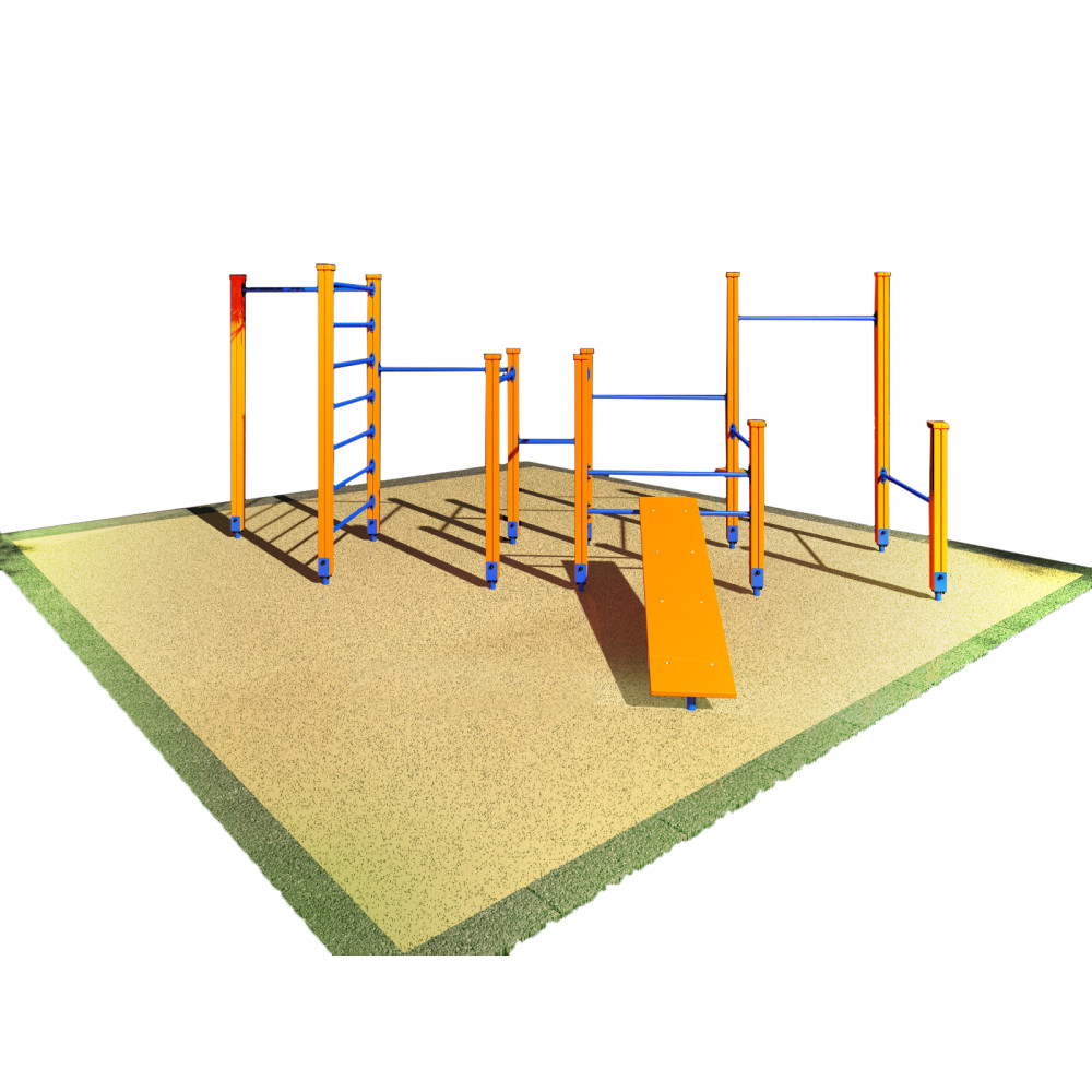 Спортивный комплекс № 9 включает шведскую стенку, четыре турника для отжимания и наклонную скамью, предназначенные для эффективных тренировок различных групп мышц.