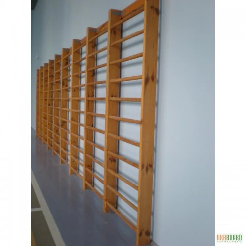 Гимнастическая стенка (шведская стенка) с высотой 2,8 метра и шириной 80 см, включает 10 перекладин и предоставляет возможность выполнять разнообразные упражнения для тренировки мышц и гибкости.