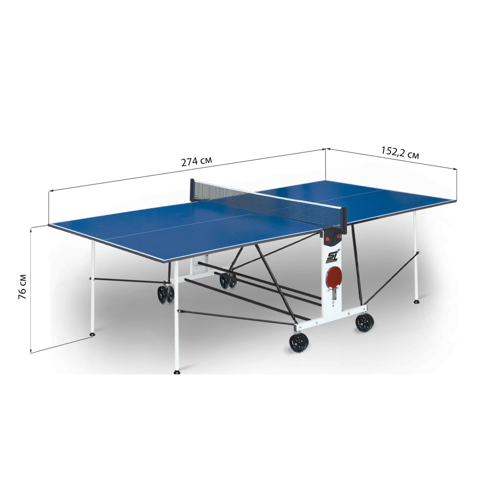 Теннисный стол COMPACT LIGHT LX - облегченная модель с размерами 274 см в длину, 152,5 см в ширину и 76 см в высоту, оснащенная встроенной сеткой с механизмом натяжения.