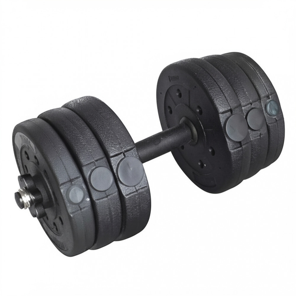 Набор разборных гантелей с общим весом 25 кг, включает две гантели по 12,5 кг каждая, выполненные из цемента и пластика.