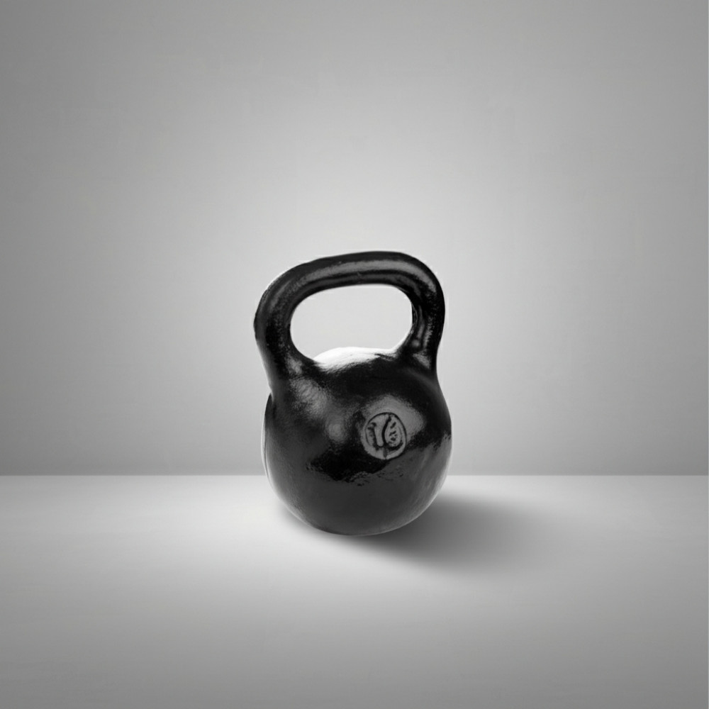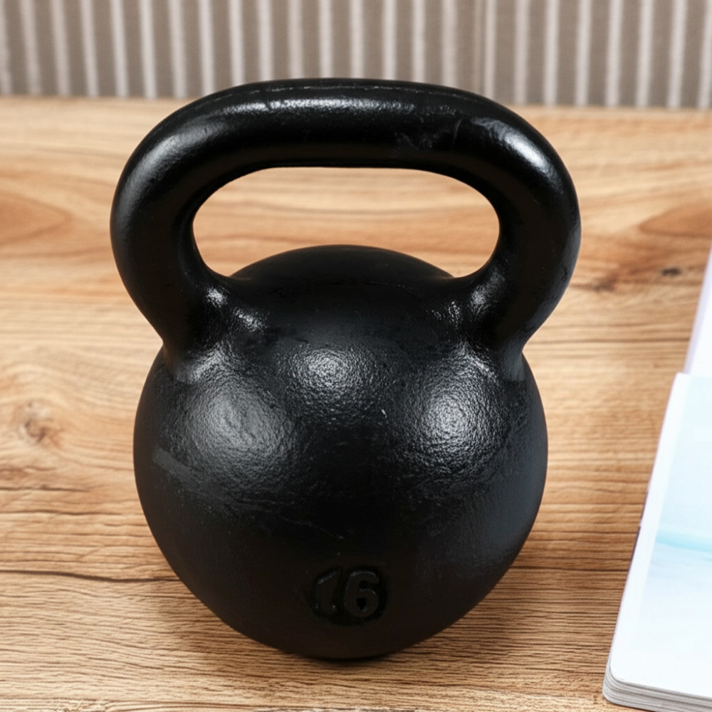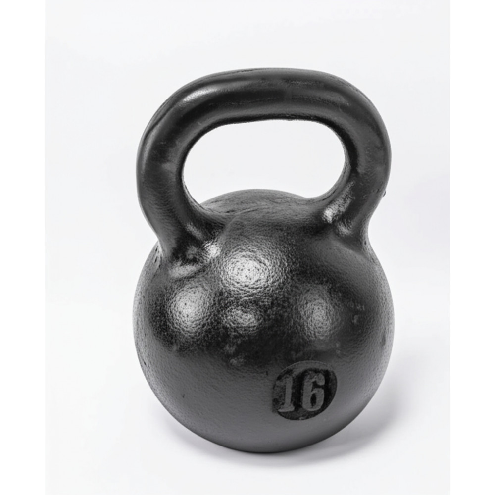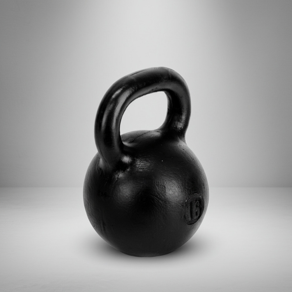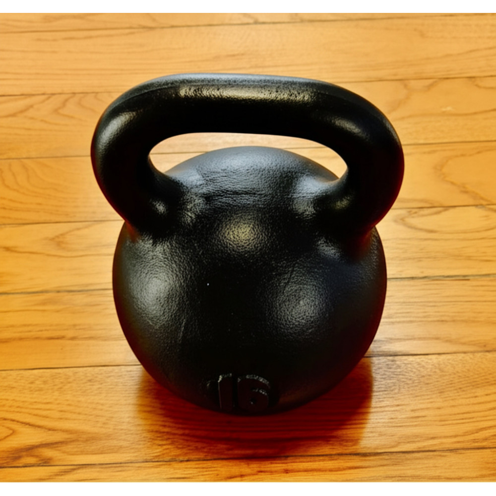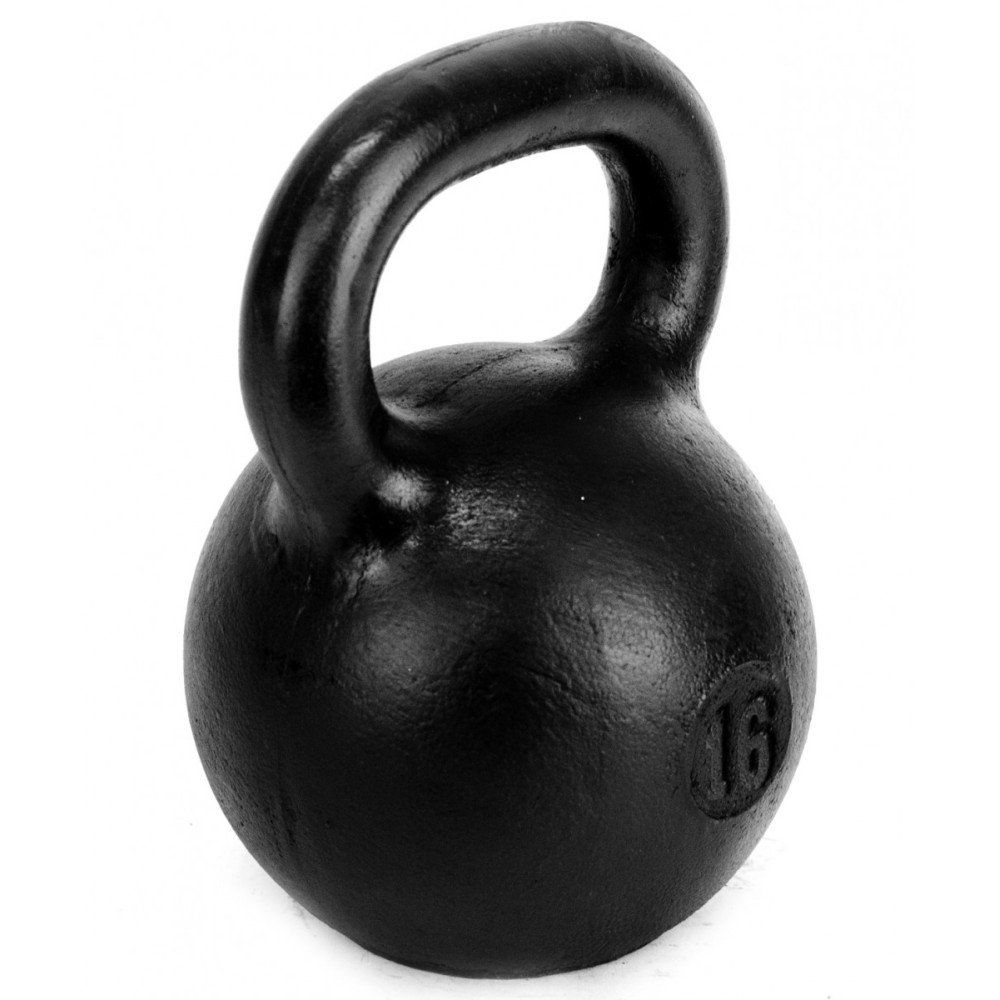 Чугунная гиря весом 16 килограммов, выполненная из чистого чугуна и покрытая полимерным составом черного цвета.