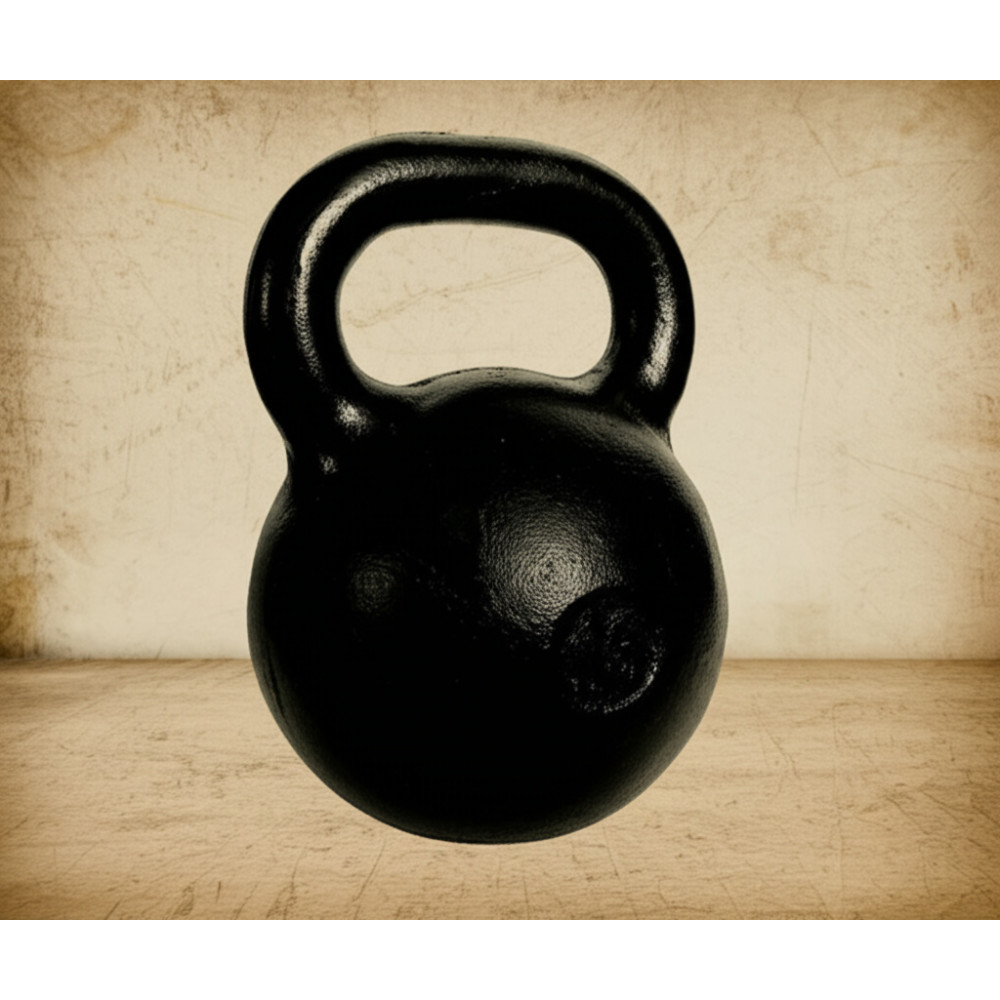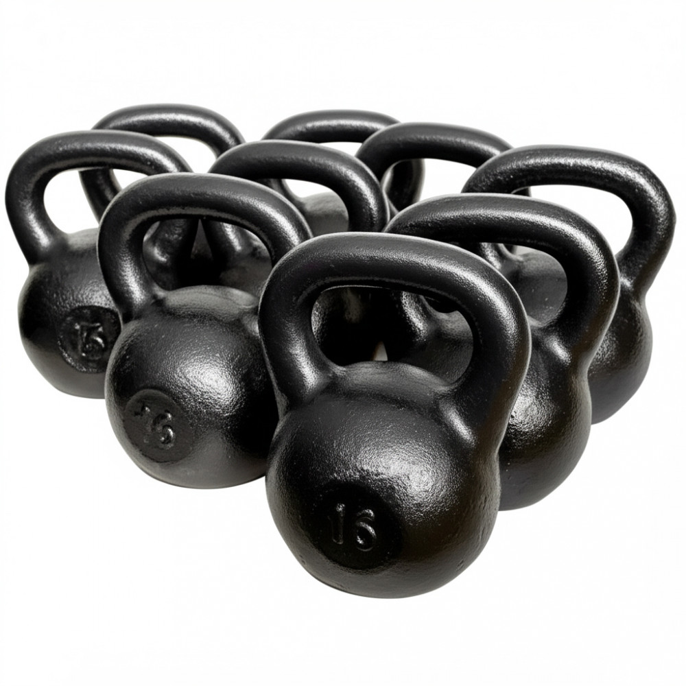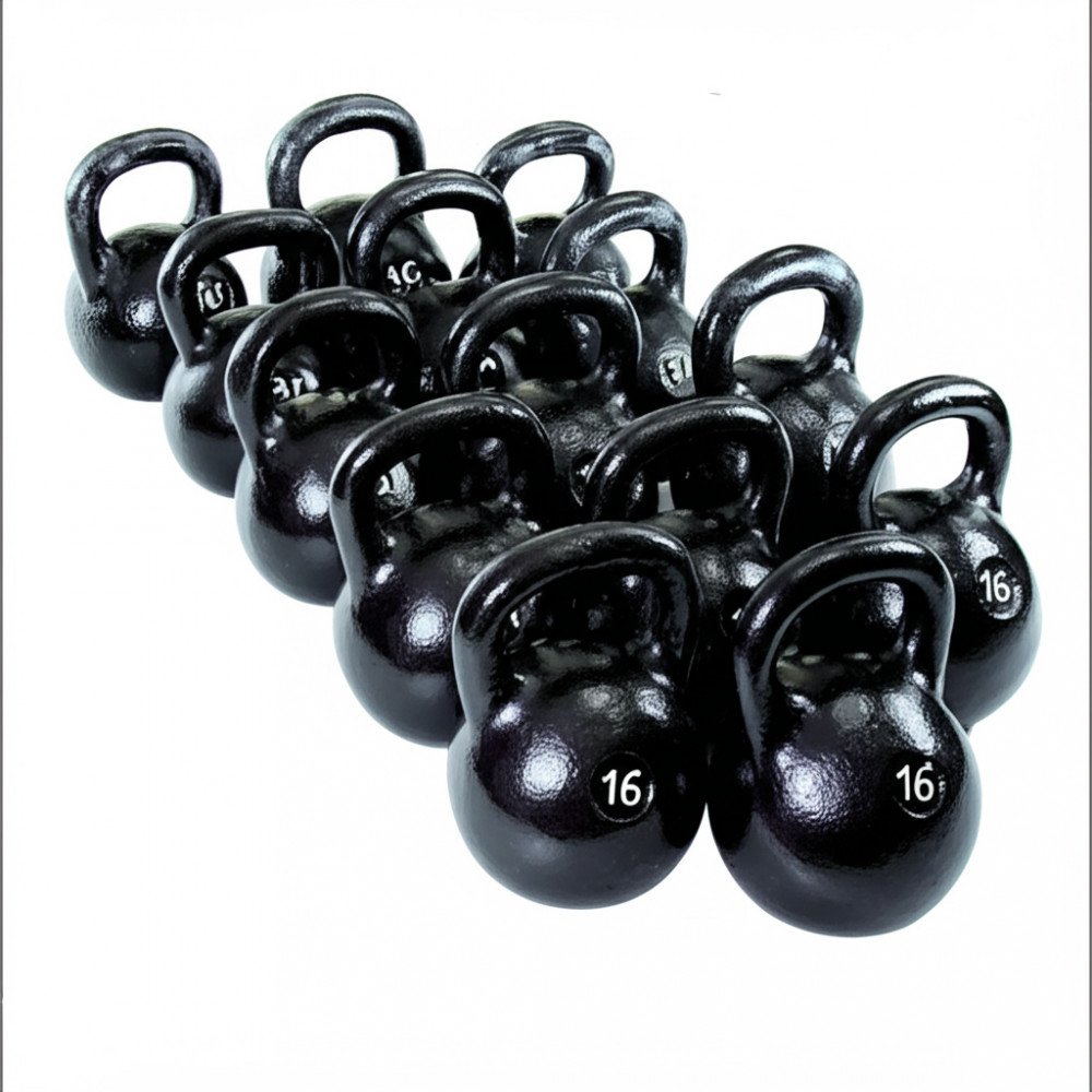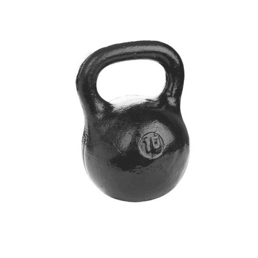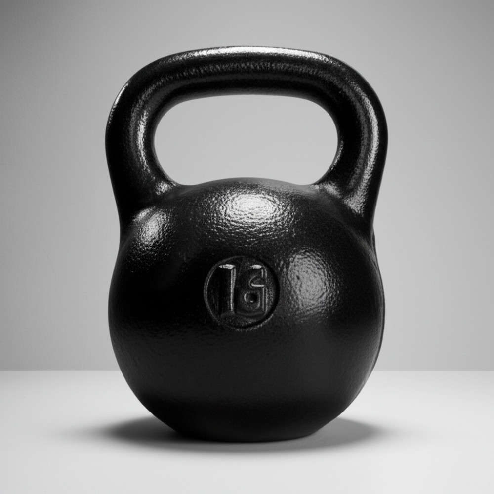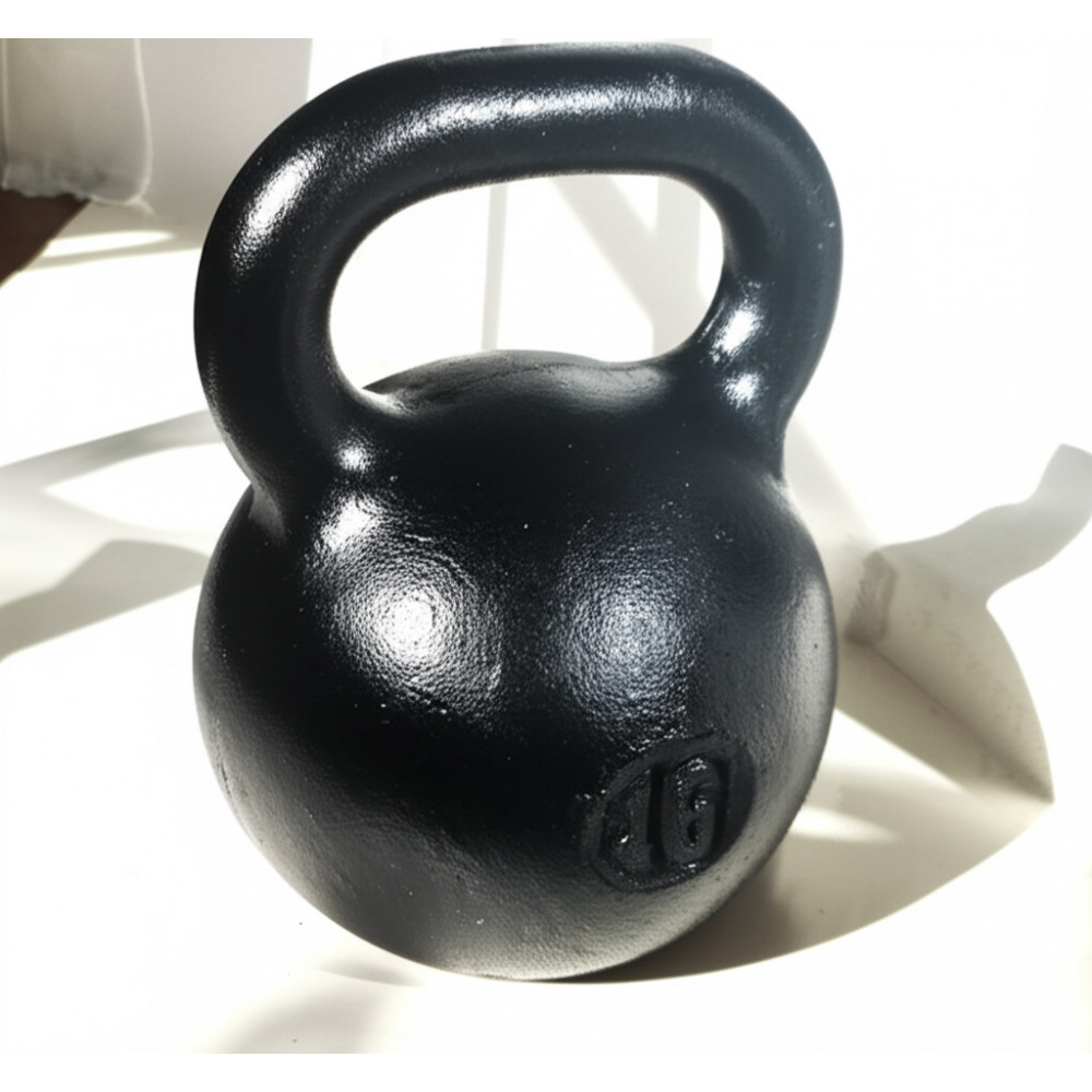 Чугунная гиря весом 16 килограммов, выполненная из чистого чугуна и покрытая полимерным составом черного цвета.