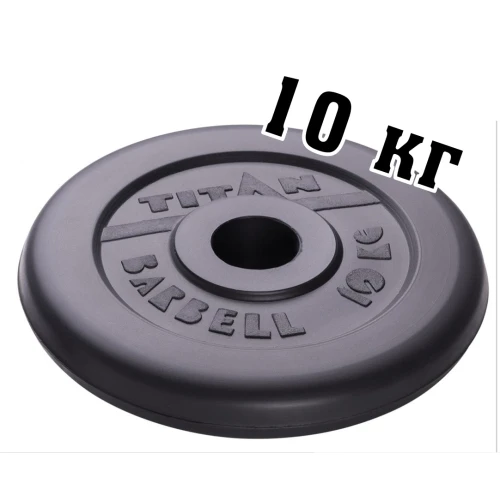 Диск обрезиненный весом 10 кг с диаметrom посадочного отверстия 51 мм, предназначенный для использования со штангами.