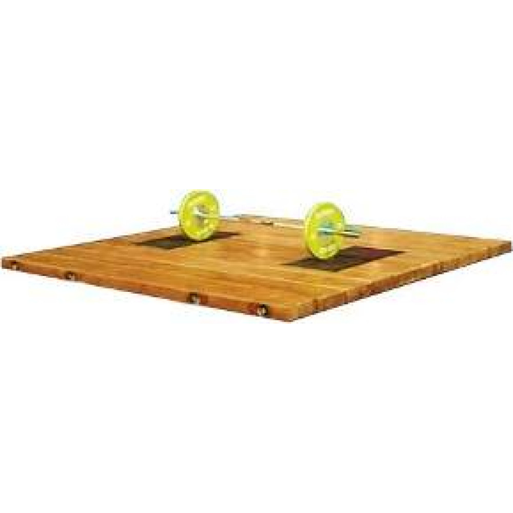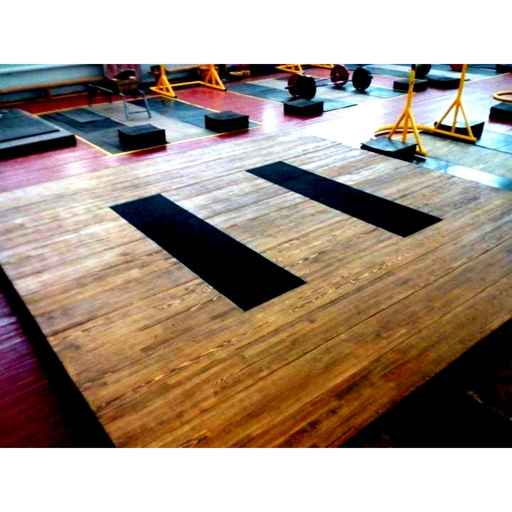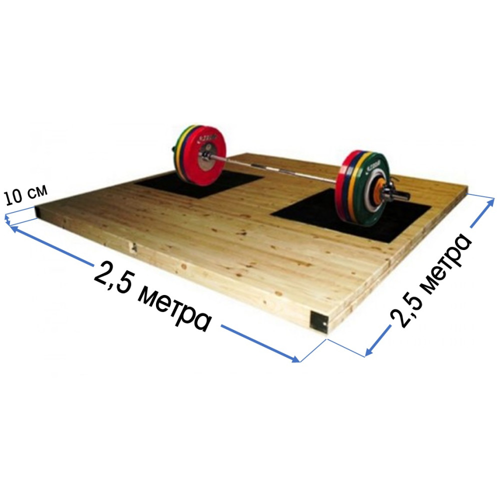 Профессиональный тяжелоатлетический помост 2.5x2.5 м для интенсивных нагрузок до 360 кг. Общая толщина 100 мм с амортизирующими резиновыми плитами для защиты пола и инвентаря. Разработан для коммерческого использования в спортивных залах и тренировочных центрах.