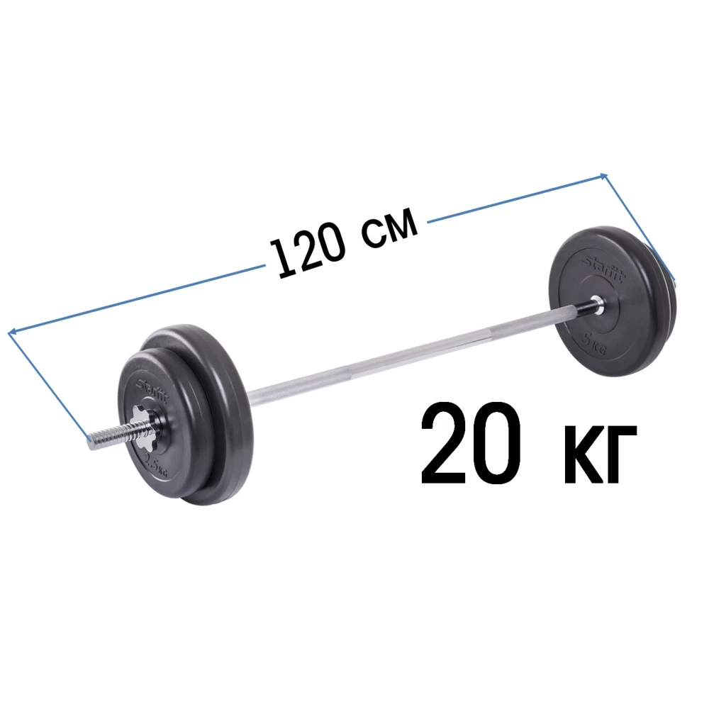 Штанга разборная BB-401 с стальным грифом и пластиковыми дисками, общий вес 20 кг, предназначена для занятий фитнесом и тяжелой атлетикой.