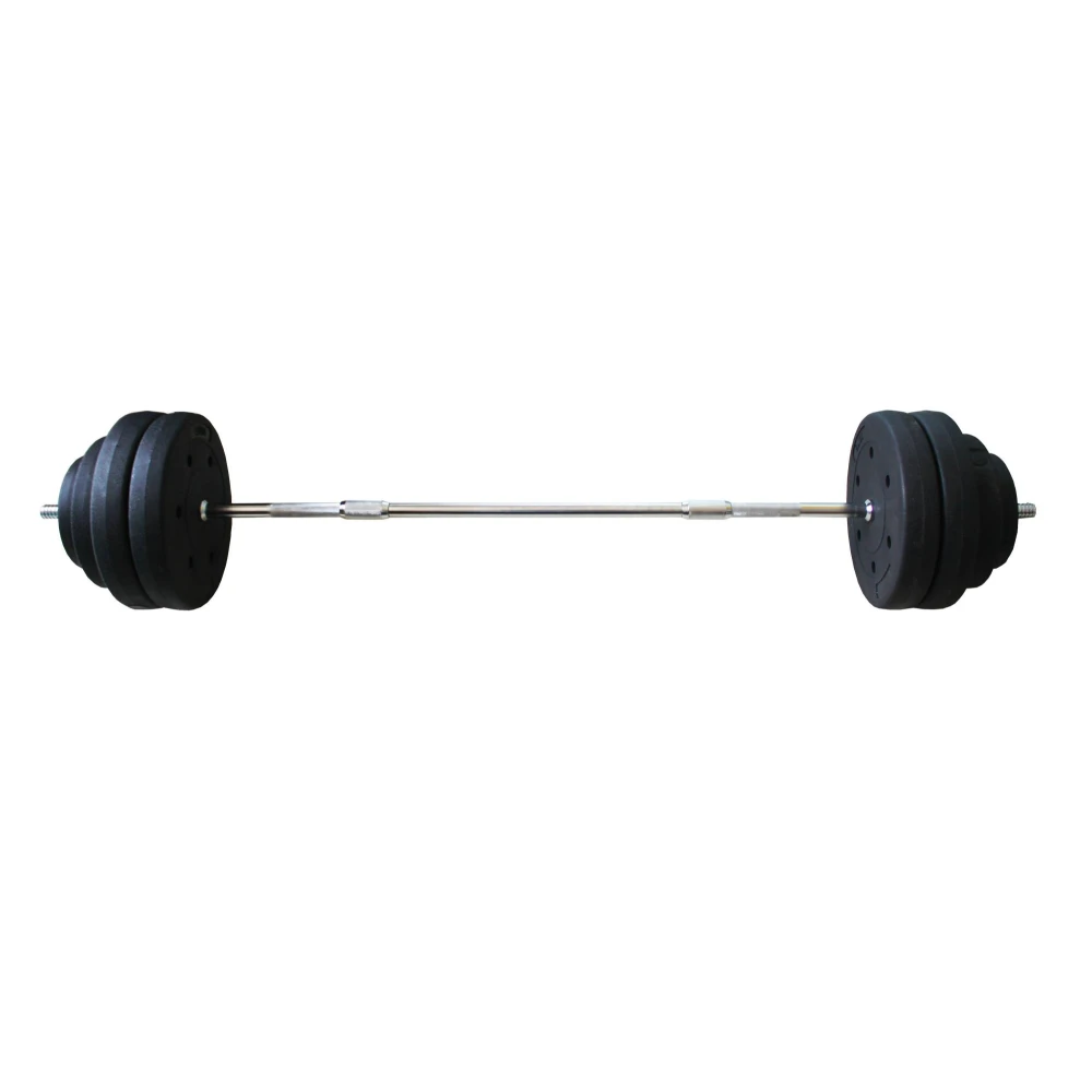 Штанга разборная MironFit весом 50 кг - это удобный снаряд для домашних тренировок, оснащенный пластиковыми дисками и прочным стальным хромированным грифом.