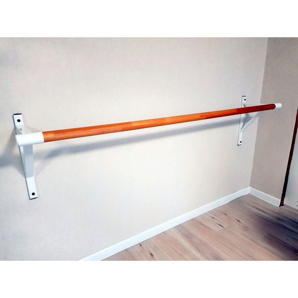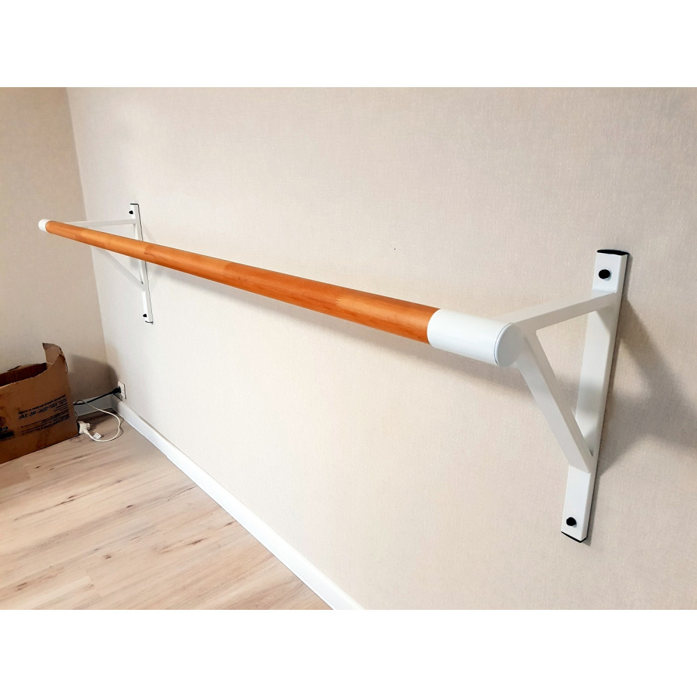Данный однорядная балетная стойка на стену – хороший выбор для оснащения хореографического зала. Станок позволит спортсменам любого роста чувствовать себя удобно во время занятий. Приятная древесина покрыта защитным лаком. По запросу можем сделать кронштейны из нержавеющей стали.
