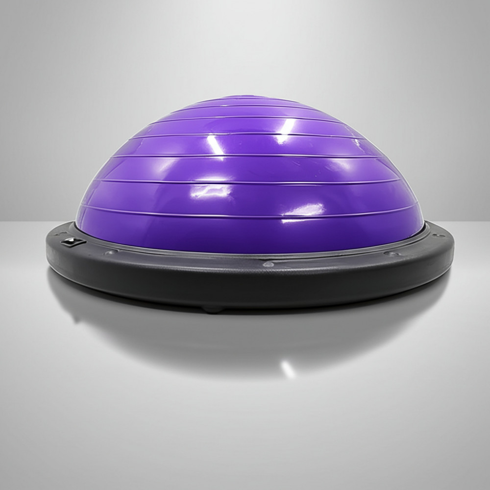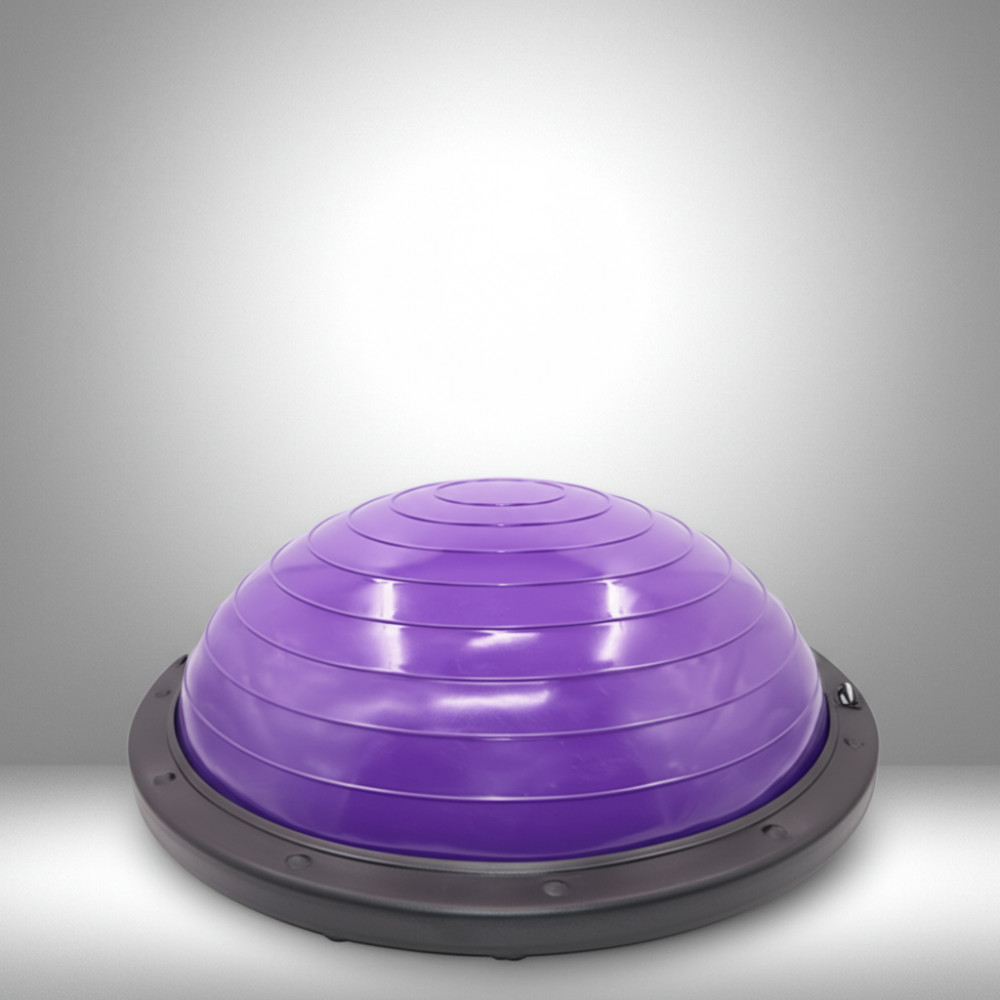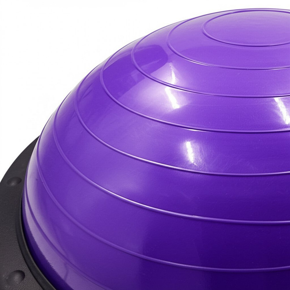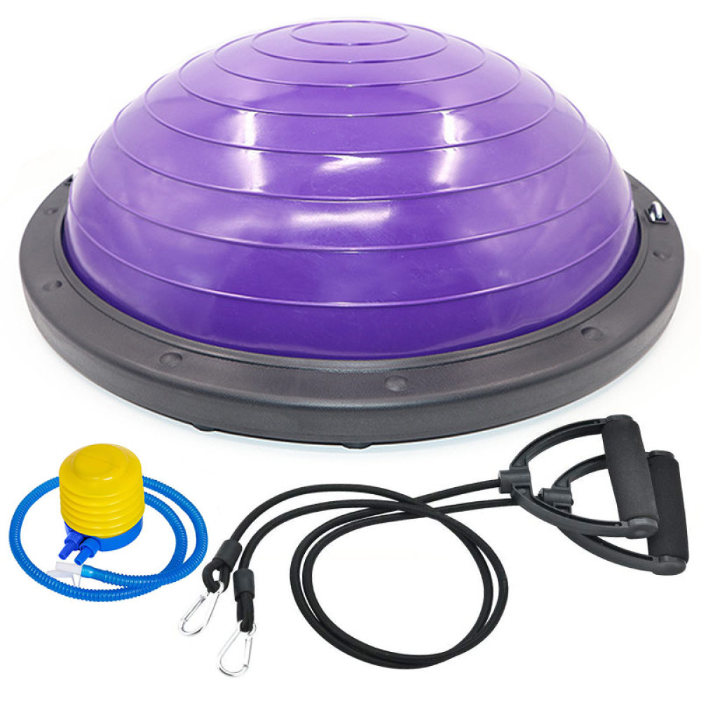 Гимнастическая полусфера BOSU диаметром 58 см (фиолетовая) в комплекте с эспандером и насосом (модель B31658) предназначена для эффективных тренировок, улучшения баланса и укрепления мышечного корсета.